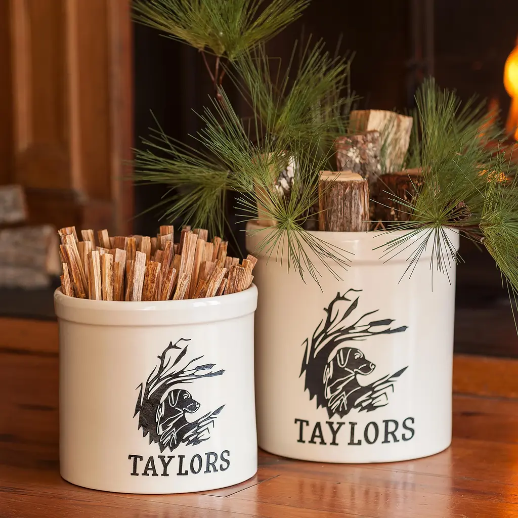 Our handcrafted, premium clay Personalized Stoneware Crock features a fetching Labrador design your family will love. Each is beautifully hand-carved with the design and your personalization (up to 10 characters), then hand-painted with a lead-free, weather-resistant finish and glaze. Design and letter are black. This versatile, attractive crock is suitable for use indoors or out. It's ideal as a planter, doorstop or house marker; to chill beverages; for hearthside Fatwood storage; or to hold kitchen utensils - the possibilities are endless. Our Stoneware Crock makes a thoughtful housewarming, wedding, Christmas or any occasion gift - it's perfect for porch, hearth, kitchen and more. This practical, personal piece is a welcome addition to any home! Food-safe. Quality made in the USA.