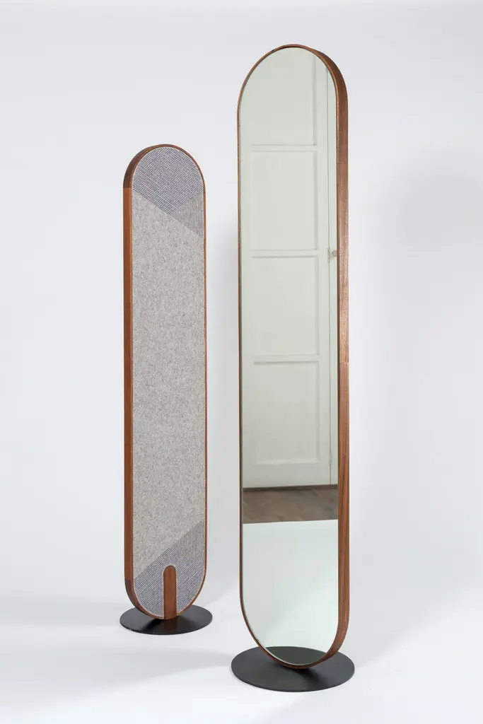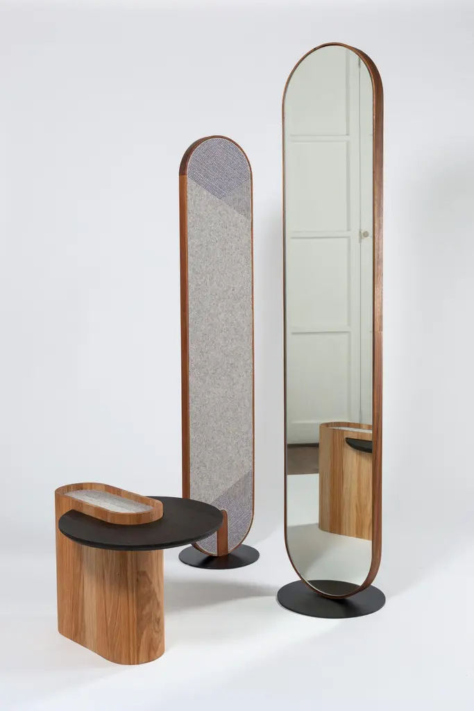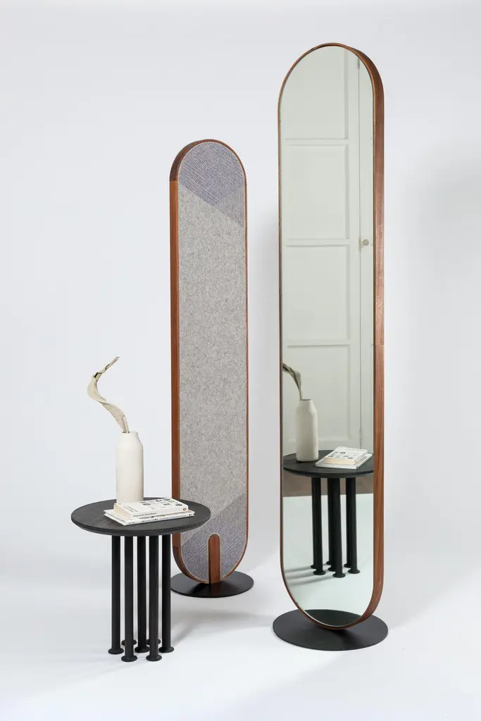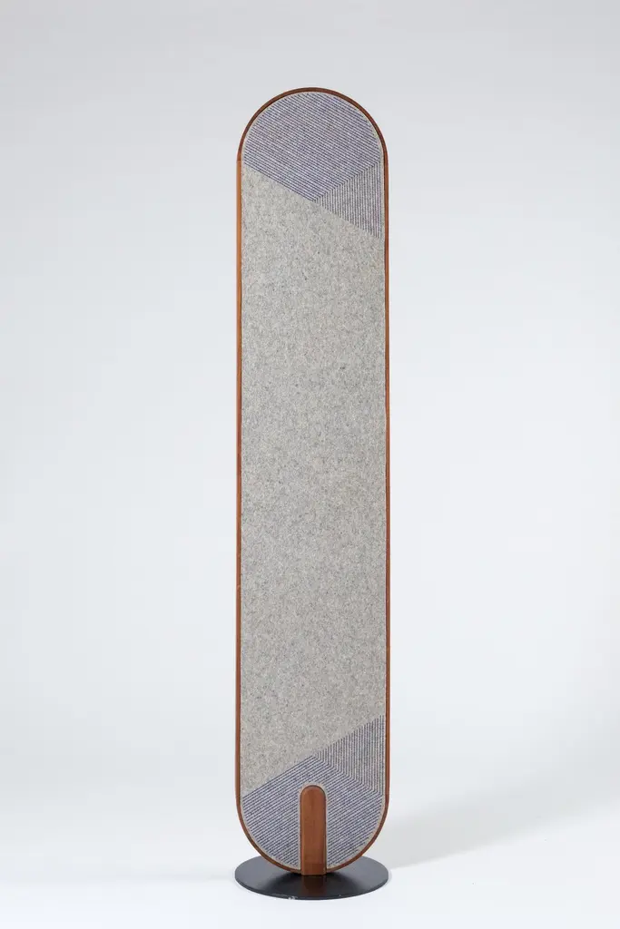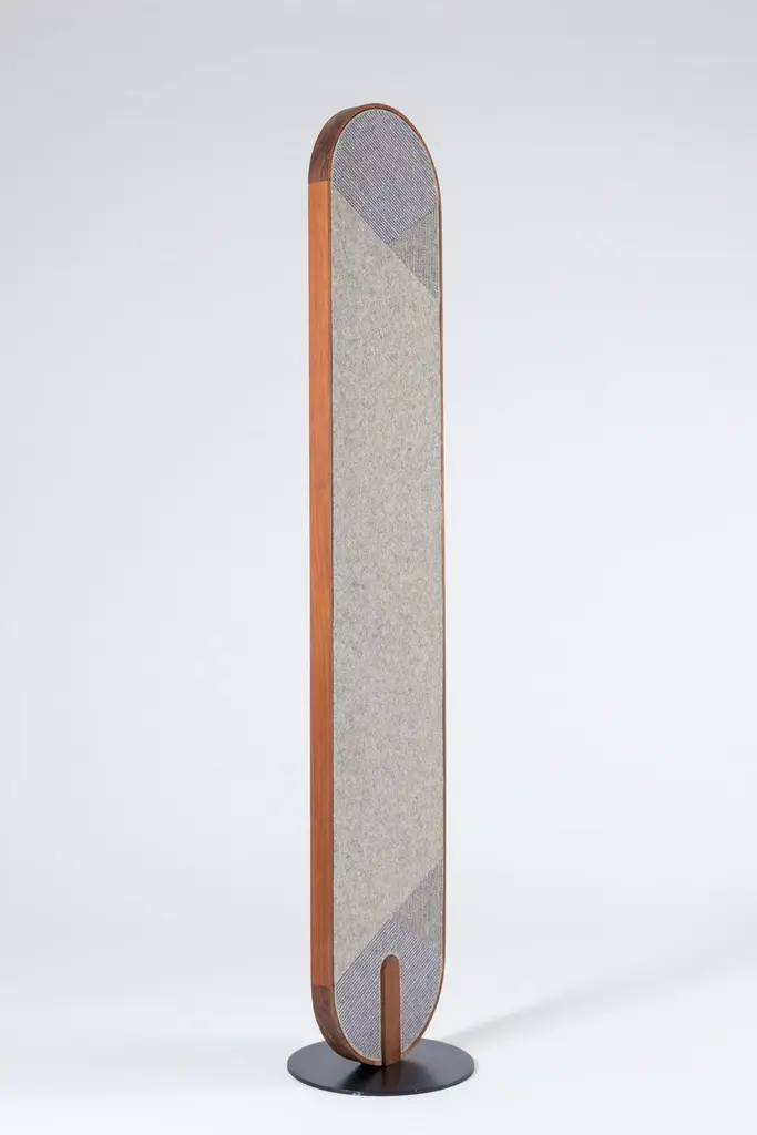 Perspectiva space divider by Colección EstudioDimensions: D 30 x W 30 x H 163 cmMaterials: oak wood, grey wool feltAlso available in ebonized oak wood and tzalam wood.Collection 02, intends to improve our relationship with the spaces we live in, through the production of pieces that invite us to inhabit through materials, shapes, colors, and textures, always taking into account social, environmental, and economic factors.The collection explores the material relationship between wood, textiles, and the possibilities that their techniques represent. With the use of color, the pieces are intended to add dynamism and depth tothe space that contains them.Inspired by the Japanese ofuro, the cylindrical shape of the table bases is made of straight sections that are manually rounded with a kanna, a Japanese woodplane.The dark tone of the pieces is achieved by ebonizing the wood with iron acetate.Each section of the space divider is finished with a thin strip of steambent wood and assembled to the structure. The textile element in this collection is made of wool felt. Digital embroidery captures the characteristic pattern that gives depth to the collection.Colección EstudioBased in Mexico City and Queretaro Coleccion Estudio creates objects at a slower pace and with a more humane process, that fosters long-lasting emotional connections with the spaces you inhabit. Inspired by stories and techniques rooted in our culture, we translate them into limited-edition furniture, accessories and art object for your home.