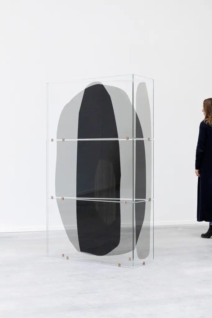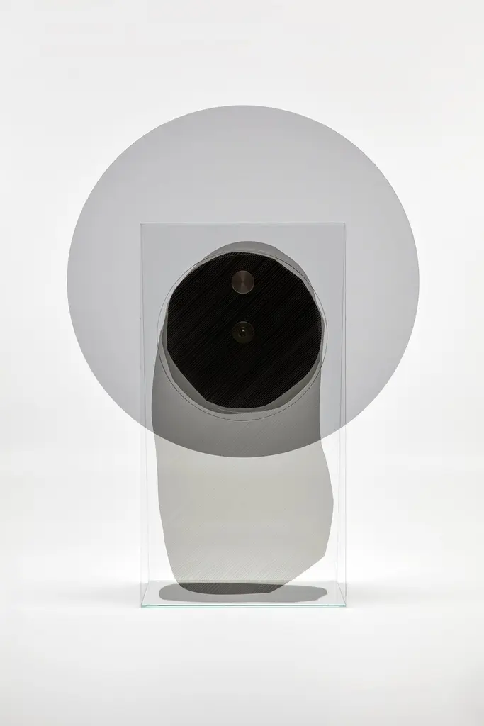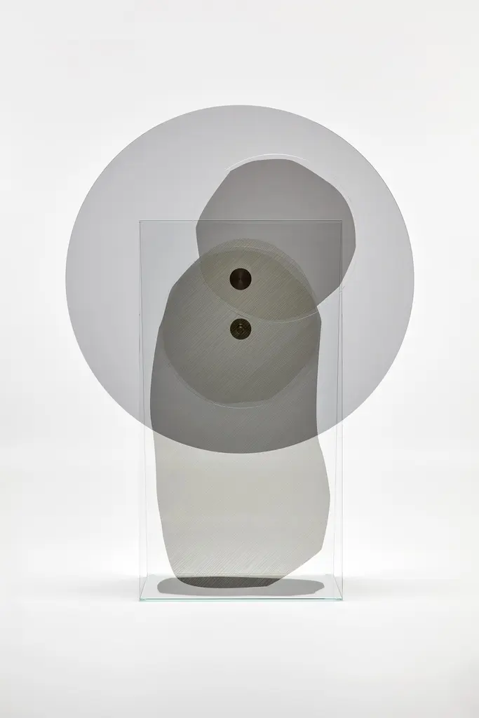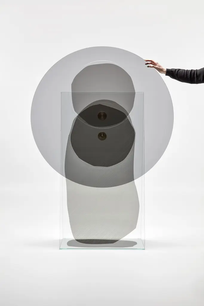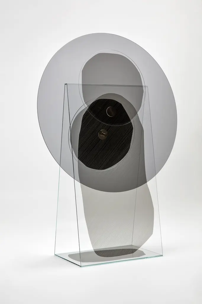 Perspective N2 by OS And OOSEdition: 3 + PTDimensions: 120 x 45 x 174 cmMaterials: GlassPerspective no.1 has the user act as the main interaction element forthey are invited to move around the work, it’s their perspective inrelation to the combinations of surfaces that cause interaction. In thecase of Perspective no. 2 the work itself has the ability to move, rotating one or both of the circular discs reveals changes in transparency.But both thrive in combination with ambient light, the immateriality of light can be made physical though the use of the filters; as light waves move vertically and horizontally, the user can therefor play with the ability to block these wavelengths and in a way make light a tangible Material.The Perspective objects are composed of reduced forms to createthe simplest of volumes, and yet self-supporting. Here everythingworks in threes for the ability to impede lights characteristics whilepassing though a surface can be changed up to 3 times. Thereforethe triangle has become the core.From the beginning OS ? OOS have been fascinated with the play of light and the manipulation there of. These works have brought this fascination to a new scale, creating objects whose intention is to combine elements that interact with their immediate surroundings.