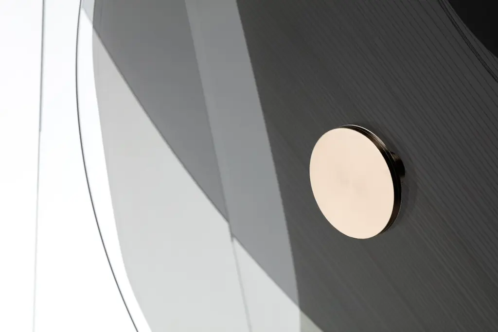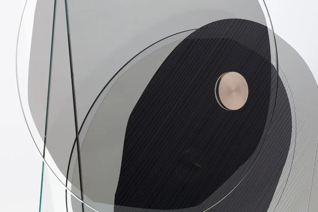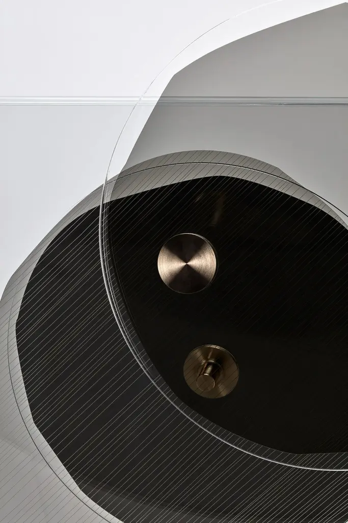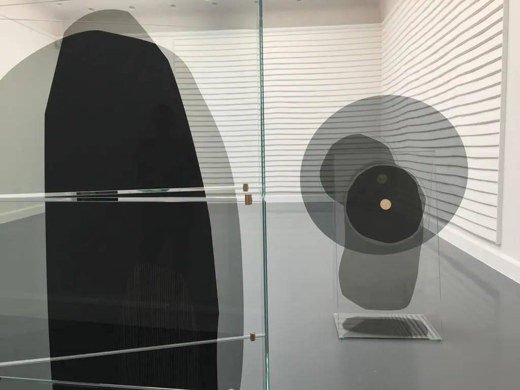 Perspective N2 by OS And OOSEdition: 3 + PTDimensions: 120 x 45 x 174 cmMaterials: GlassPerspective no.1 has the user act as the main interaction element forthey are invited to move around the work, it’s their perspective inrelation to the combinations of surfaces that cause interaction. In thecase of Perspective no. 2 the work itself has the ability to move, rotating one or both of the circular discs reveals changes in transparency.But both thrive in combination with ambient light, the immateriality of light can be made physical though the use of the filters; as light waves move vertically and horizontally, the user can therefor play with the ability to block these wavelengths and in a way make light a tangible Material.The Perspective objects are composed of reduced forms to createthe simplest of volumes, and yet self-supporting. Here everythingworks in threes for the ability to impede lights characteristics whilepassing though a surface can be changed up to 3 times. Thereforethe triangle has become the core.From the beginning OS ? OOS have been fascinated with the play of light and the manipulation there of. These works have brought this fascination to a new scale, creating objects whose intention is to combine elements that interact with their immediate surroundings.