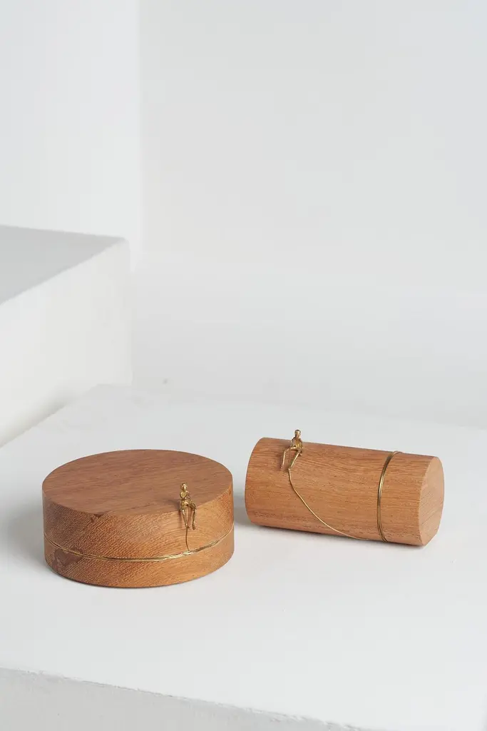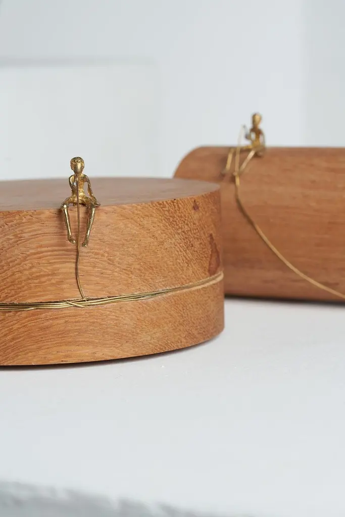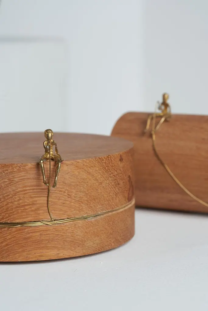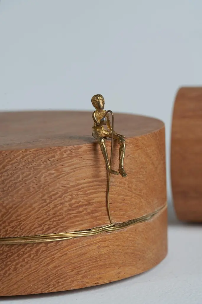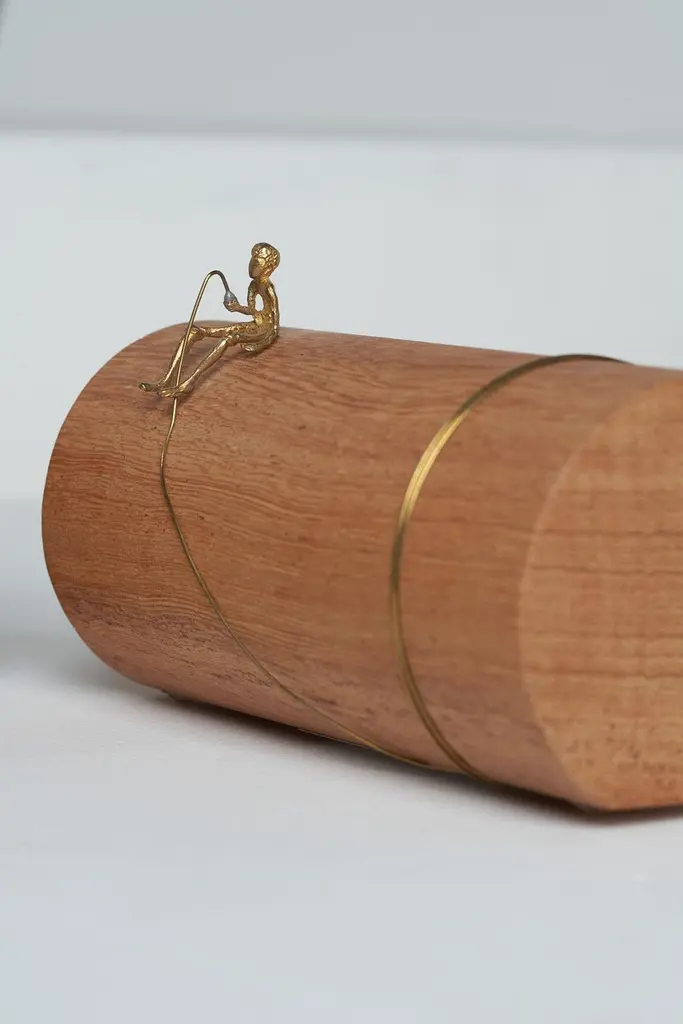 PESCADOR (FISHERMAN) SERIESFrom so many fish, emerges the need to pursue the new. Again. And again. The Pescador Series contemplates the private hook, which drifts and feeds on chance.Its images carry as many meanings as the uncertainties of those who dare to sail. Open sea, flowing river, fisherman of illusions. For the environments, the deck that suits the best. For the reader, the silent wait for the waiting to make sense.N9 Sculpture (Circular) D15cm x 9cmN10 Sculpture (Sideways) D6,5cm x 15cm_Material: Wood and Brass_Price of set