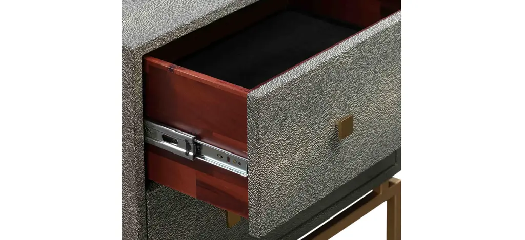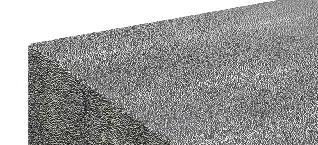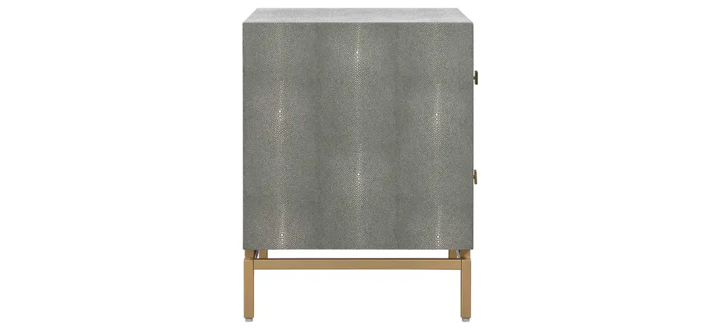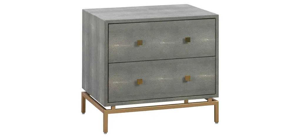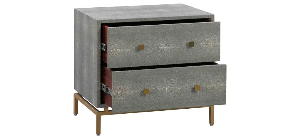 Attention to detail is perfectly displayed with the Pesce Nightstand. Everything from its textured shagreen finish, dramatic brass legs and handles, to the drawers finished in cherry wood come together beautifully to provide elegance and contemporary style to your space.