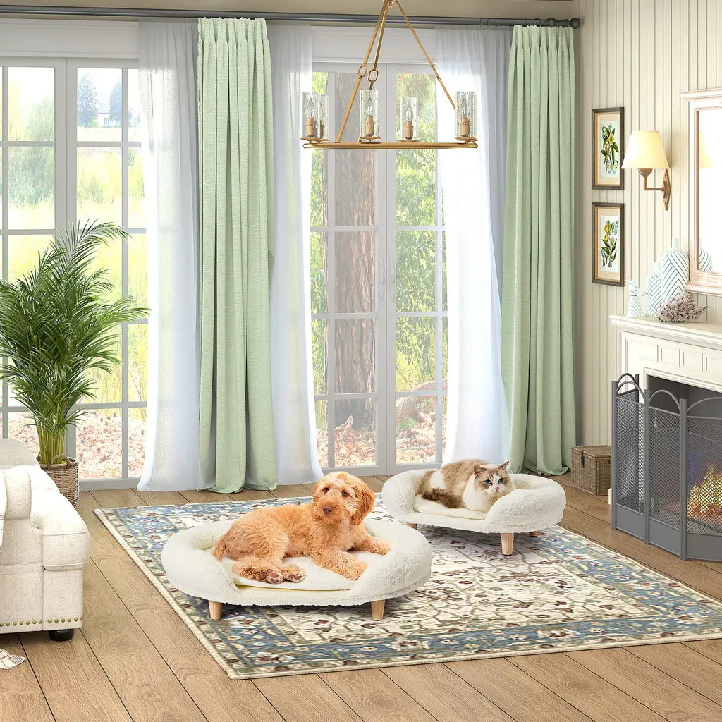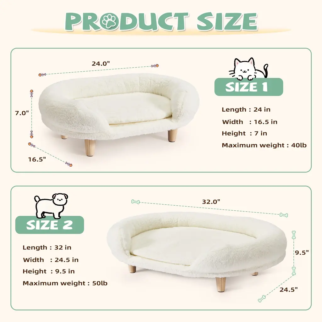 Offered in a large and small size to suit multi-pet homes. The 24'' x 16.5'' size is ideal for small dogs and cats, while the 32'' x 24.5'' size fits medium dogs or two cats, providing flexible choices for your pets. The semi-circular backrest offers a cozy space for pets to curl up and sleep, giving them a sense of security. The solid wood legs elevate the pet sofa, keeping it off the ground for added comfort. Crafted from high-quality wood, this cat sofa is incredibly sturdy and durable. The four wooden legs ensure stability, and each leg is equipped with anti-slip pads to prevent floor scratches and reduce noise.The sofa is filled with high-quality PP cotton, providing a comfortable sleeping experience. The plush sponge cushion is designed to offer a soothing resting spot for your pets. Our cat bed features a removable and washable cushion that is thick and soft, making it easy to clean at any time. It's versatile for use in various settings throughout the year.