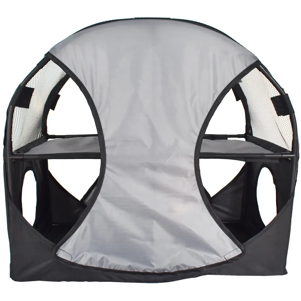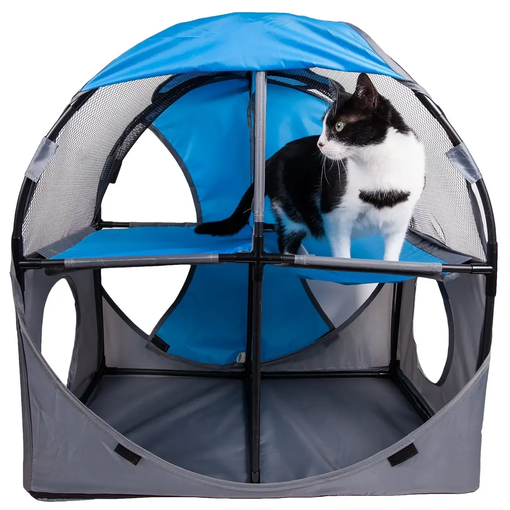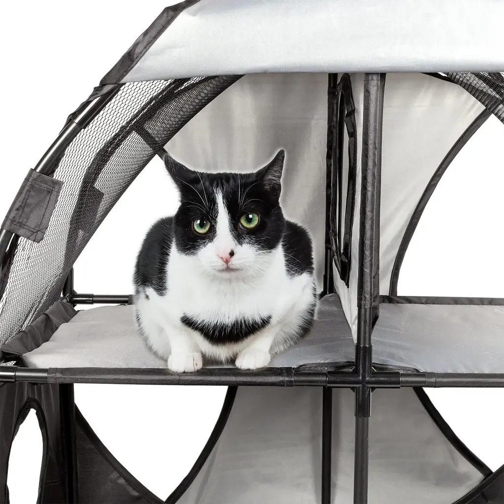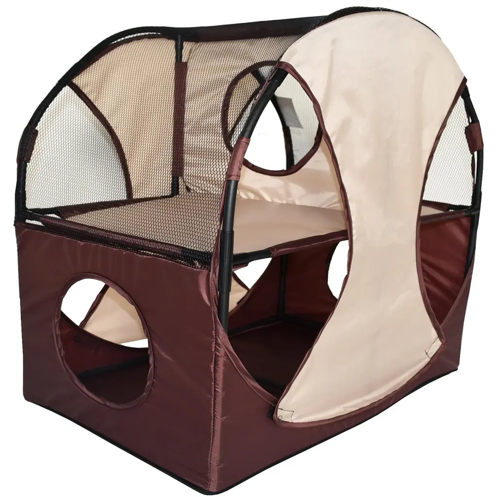 Accommodate your feline friends with this soft folding travel pet house, which has four pass-through entrances on the bottom level and dual mezzanine holes above. Made from PU-coated polyester and mesh netting with lightweight metal poles, this cat house is sturdy enough to hold more than 120 pounds, making it suitable for multiple-cat households.