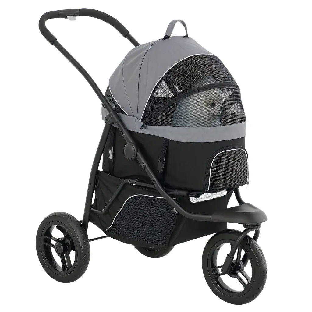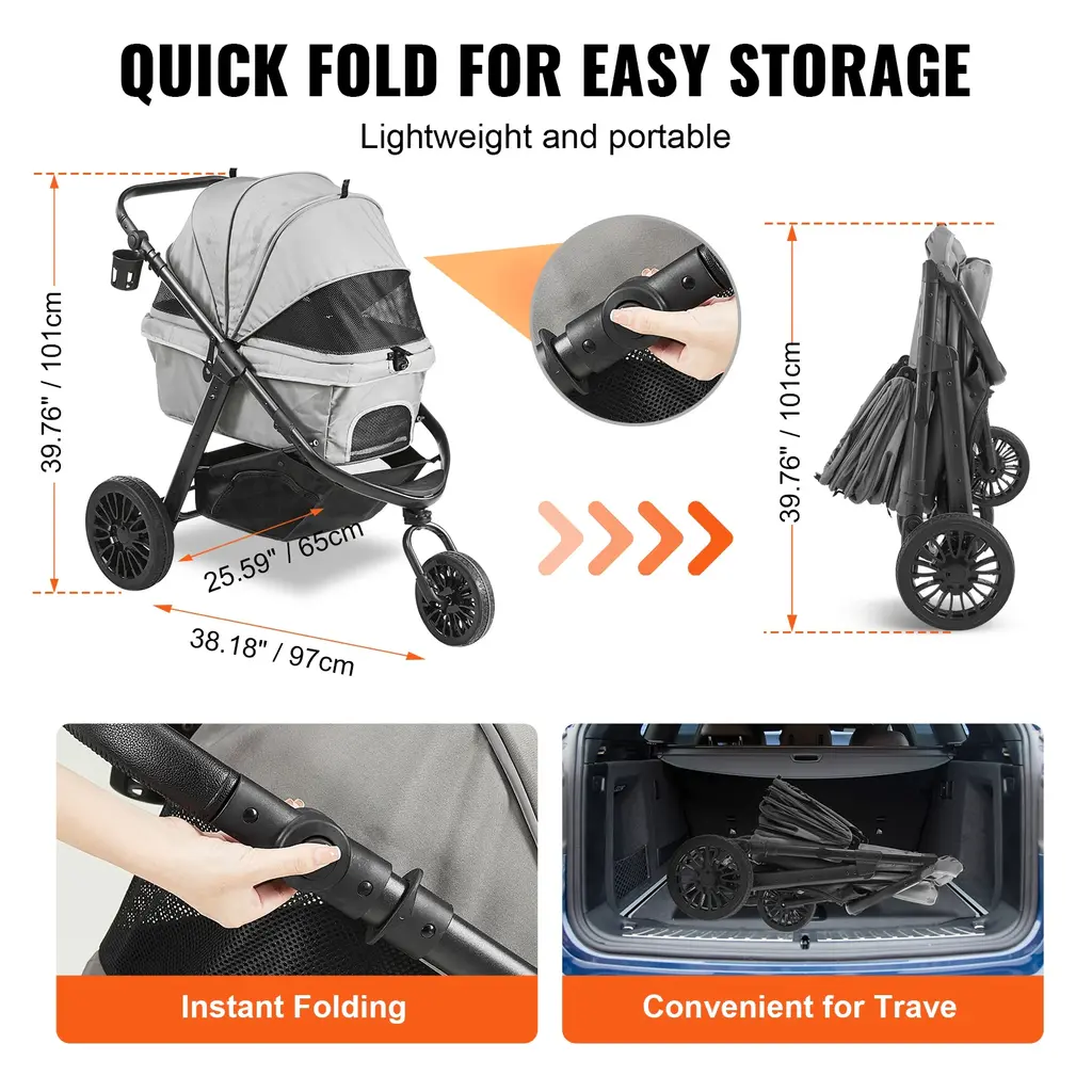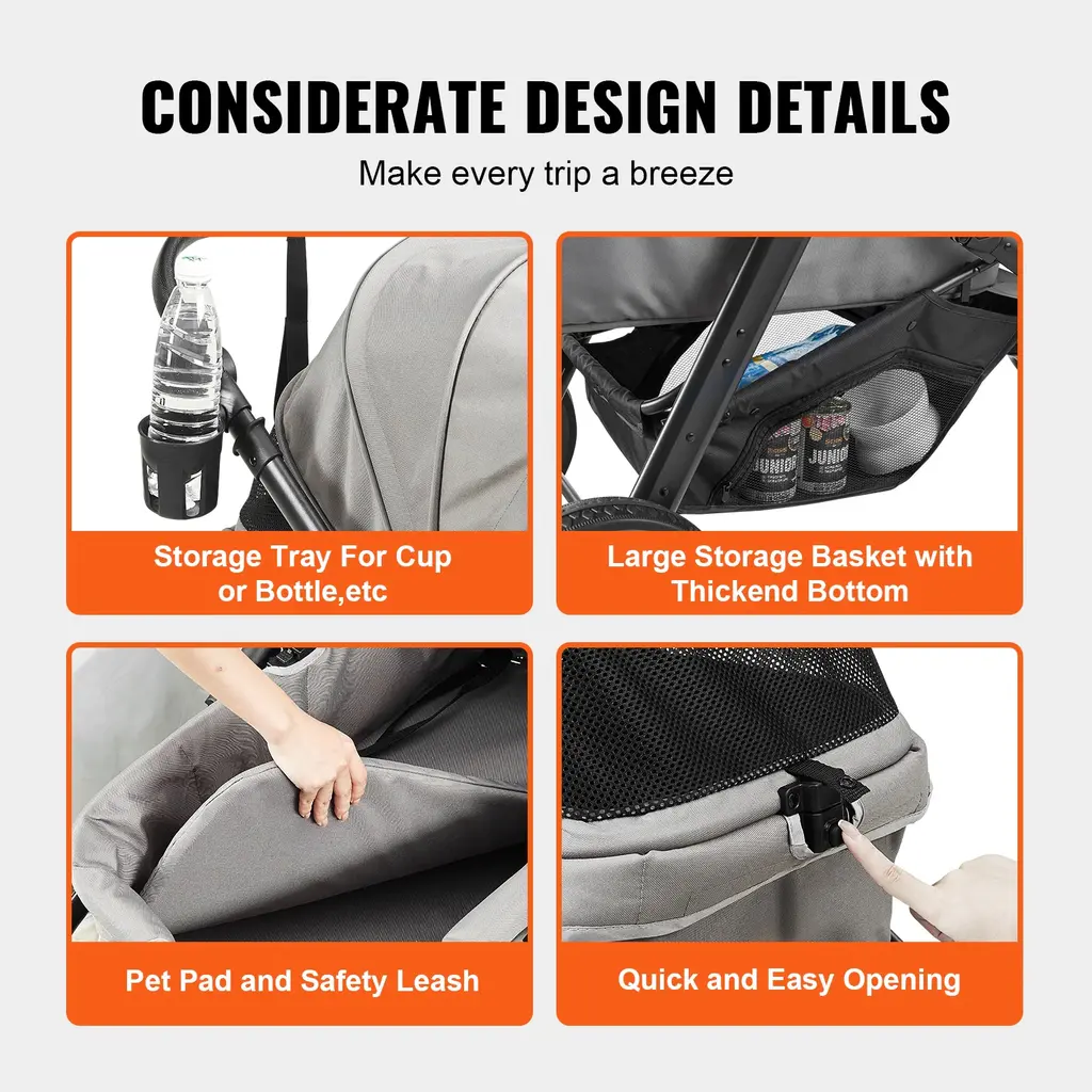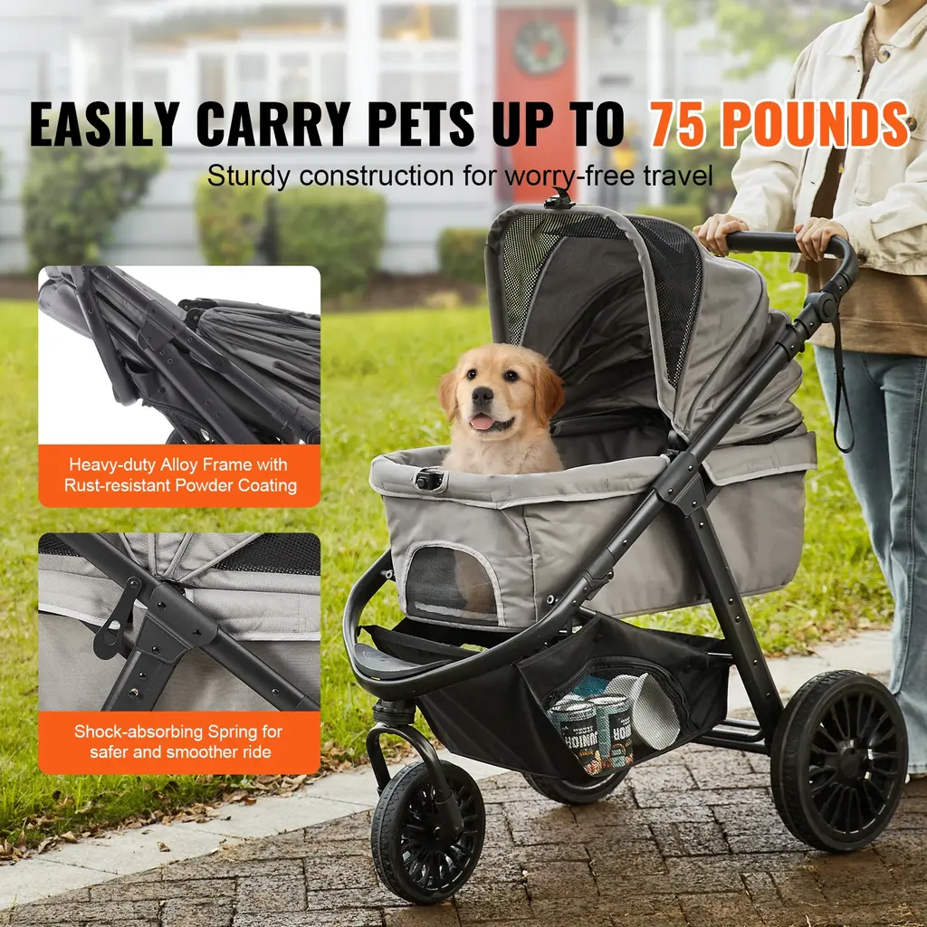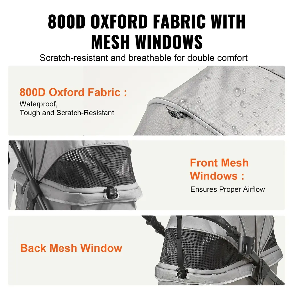 35-160 lbs Weight Capacity: This pet stroller features a robust alloy frame and rust-resistant powder coating, ensuring durability and longevity. Whether it's a leisurely park stroll or a long journey, it provides your pet's comfort and safety. Flexible Large Wheels: This dog stroller has EVA large wheels (7" front, 12" rear), ensuring a comfortable ride for your pet on any path. The 360° swivel front wheels provide easy maneuvering. The reliable link brake system ensures safety, making every outing with your furry friend enjoyable and convenient. 600D Oxford Fabric: The sturdy 600D Oxford fabric can withstand pet nibbling, keeping the cat stroller in pristine condition. It can ensure the safety and comfort of your pet. Four-Sided Breathable Mesh Windows: The puppy stroller's mesh windows provide unobstructed scenic views for your pet while allowing you to monitor your pet's well-being at any time. Safe and liberating, it's the ultimate travel companion for your pet. Multiple Height Adjustments: The pet gear stroller's unique multiple-height adjustment design ensures that every user can find their comfortable height, turning long walks with your pet into an enjoyable experience. Package Content 1 x Pet Stroller 1 x User Manual 2 x Rear Wheel Covers 2 x B-Type Clips (1 x Pet Stroller 1 x User Manua for 44 lbs option (1 x Pet Stroller 2 x Rear Wheel Covers 2 x B-Type Clips 1 x User Manual 5 x Screws) for 35 lbs option (1 x Pet Stroller 1 x Sleeping Pad 1 x Wrist Strap 1 x Cup Holder) for 75lbs option