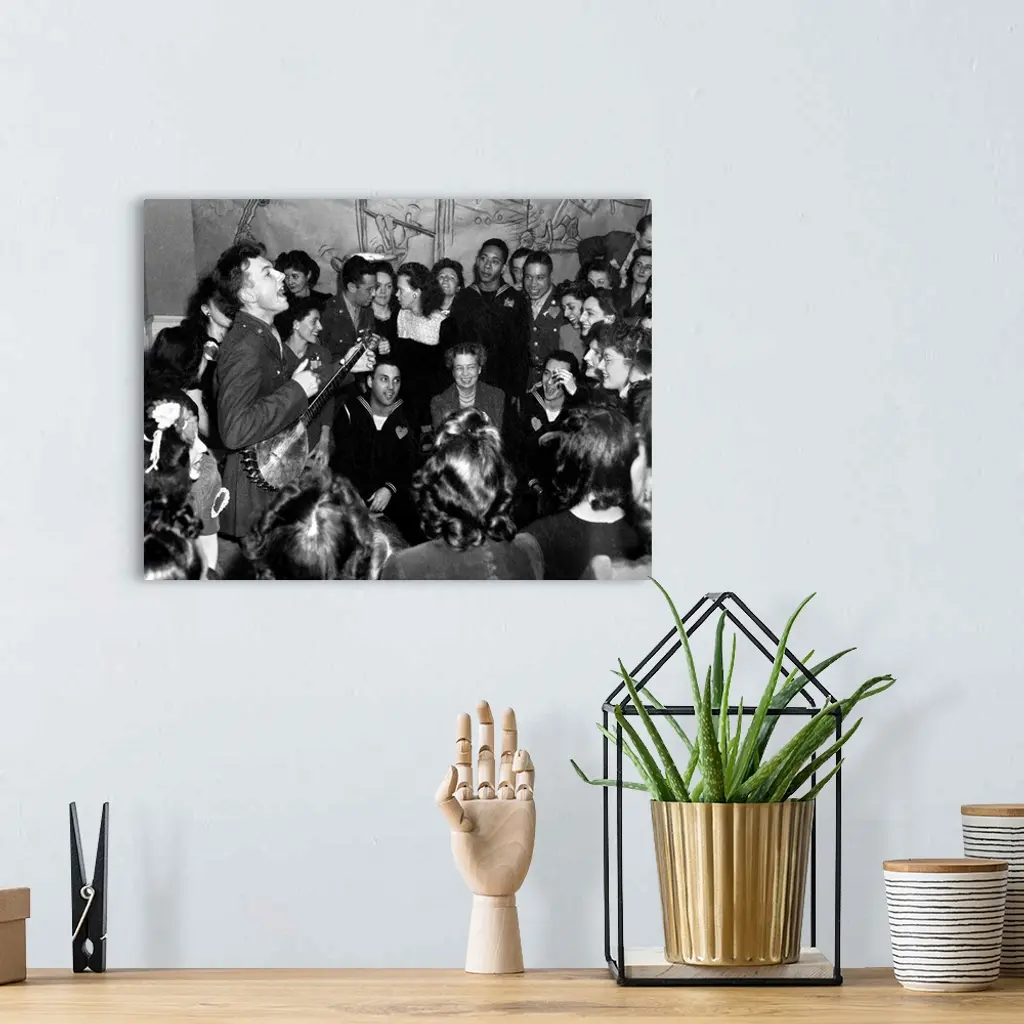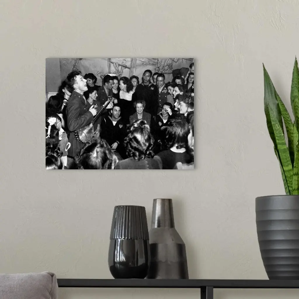 American folk singer and composer. Performing at the opening of the Washington D.C. labor canteen, sponsored by the United FederalLabor Canteen and the Congress of Industrial Organizations (CIO). Eleanor Roosevelt is in the audience. Photograph by Joseph Horne, 1944.
