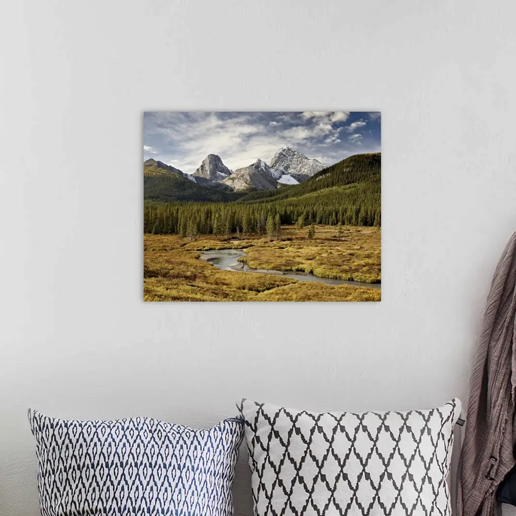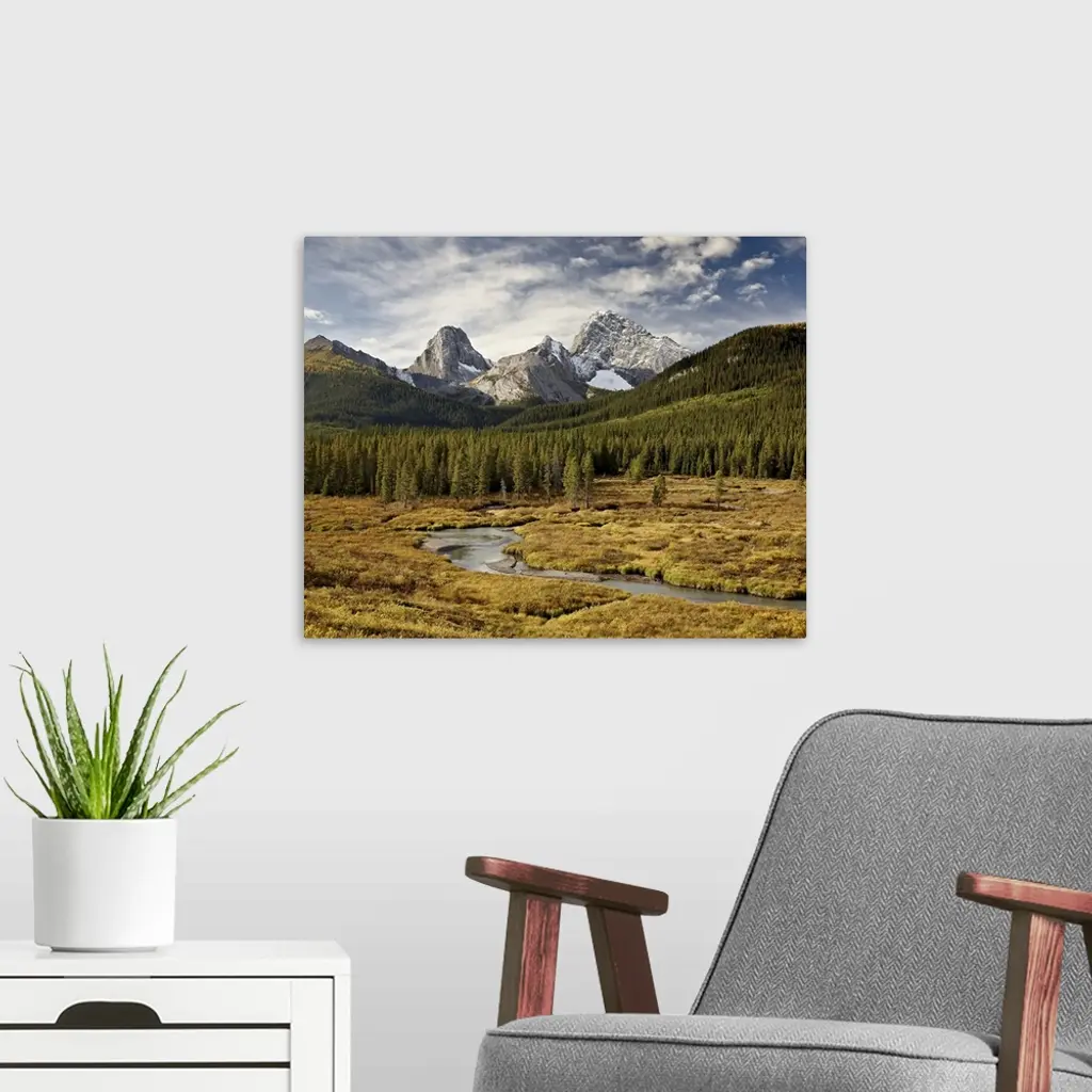 Alpine scene in the fall with Smutts Creek, Commonwealth Peak on left, Pigs Tail (Sharks Tooth) in the center and Mount Birdwood on the right, Peter Lougheed Provincial Park, Kananaskis Country, Alberta, Canada, North America