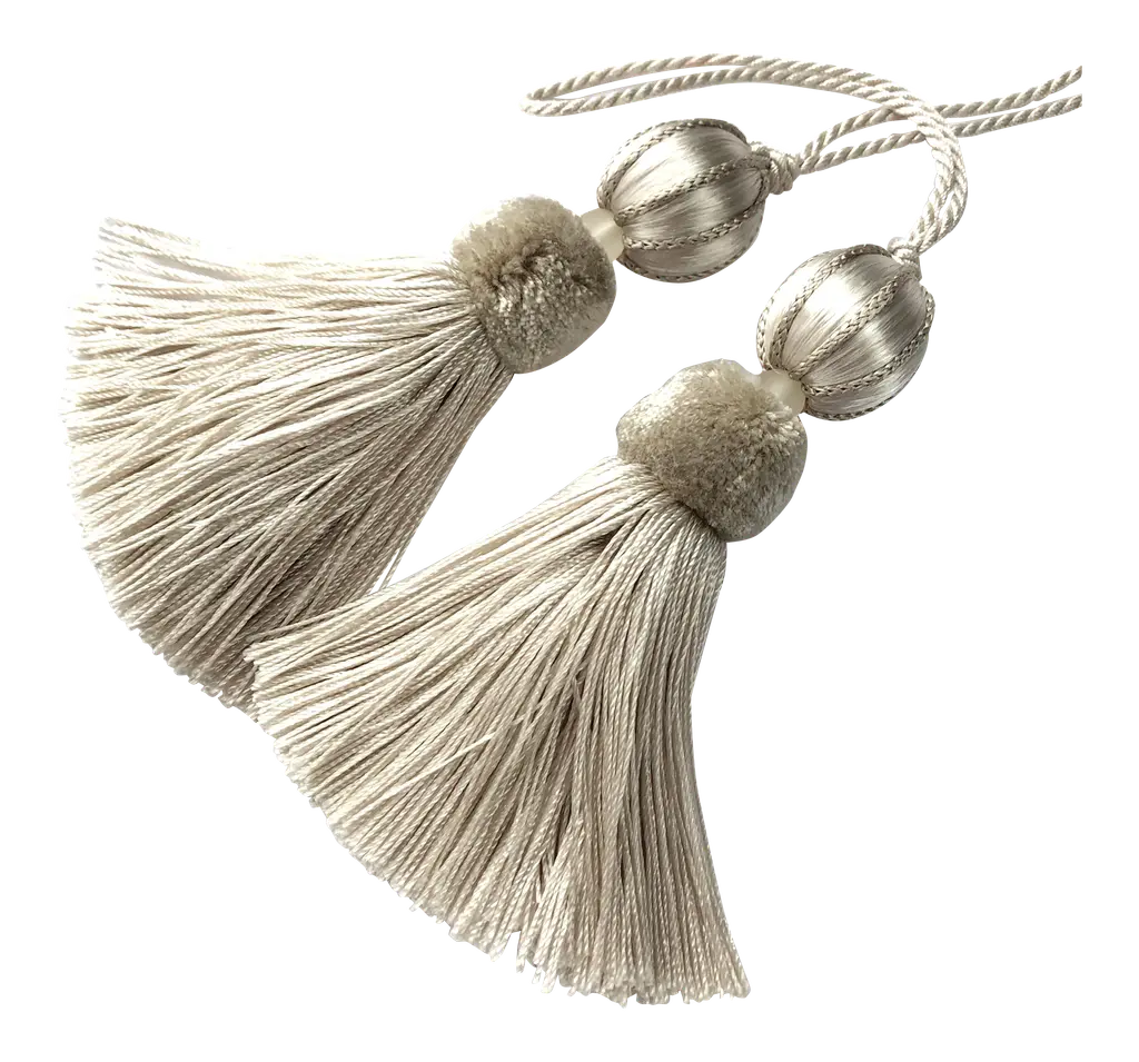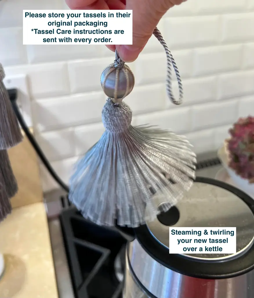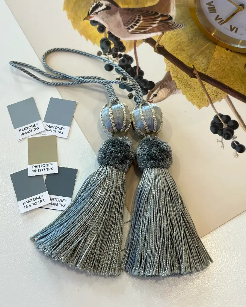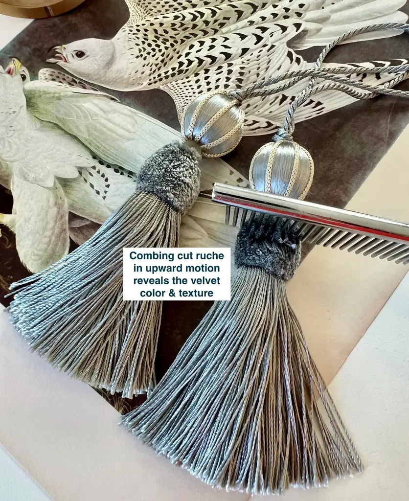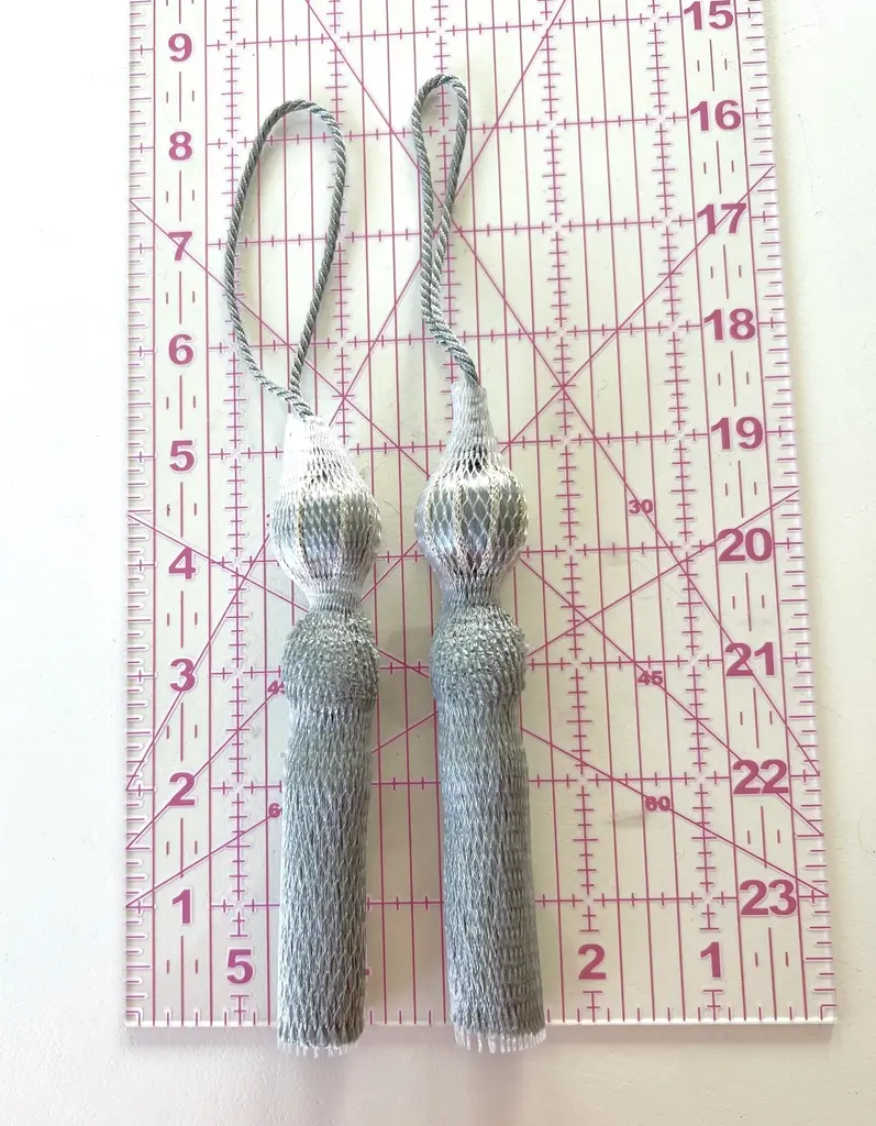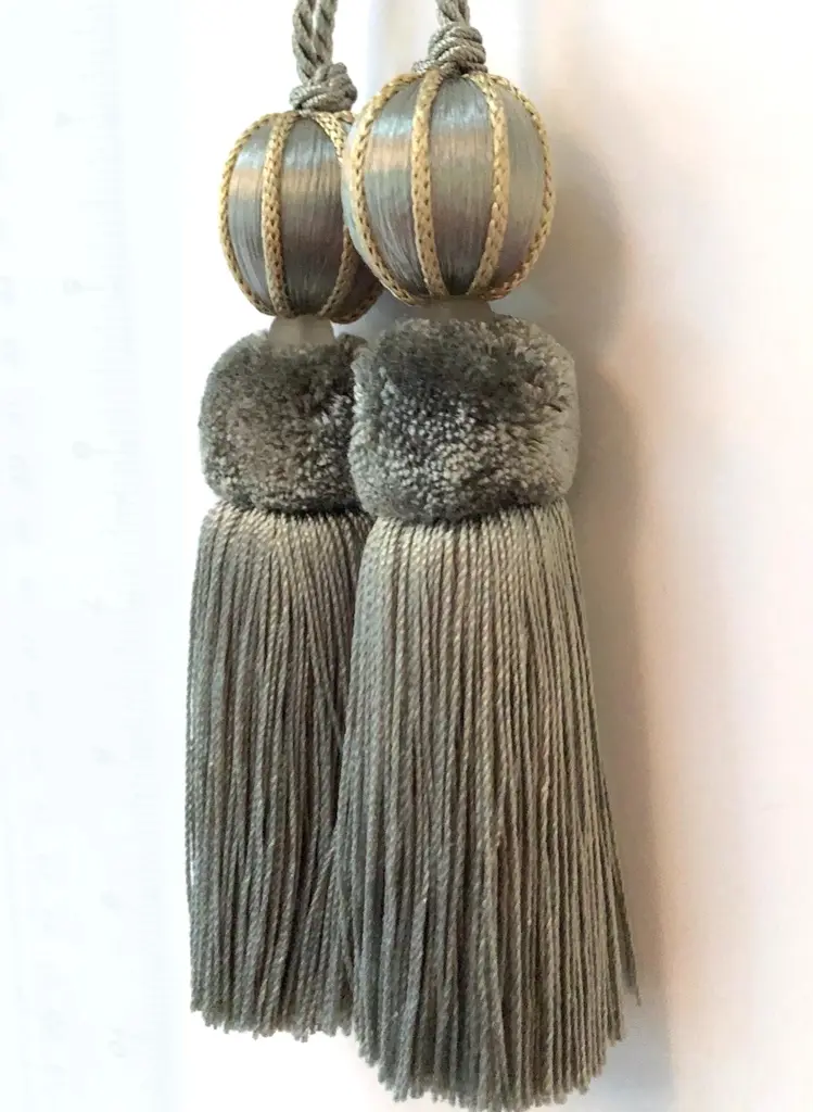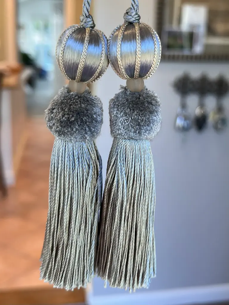 A pair of handmade, vintage-style key tassels in "bluestone" with a cut velvet deep grey/aqua, cut velvet ruche. Custom key tassels add charming detail to desks, custom cabinets, or drawers and textiles. Tassel details include: Satin wrapping with neutral frosted glass bead, silky-textured skirt and contrasting white cord. Dimensions: Overall height = 8.5"" Tassel height only = 4.5” Depth = 2” Dimensions may vary slightly as tassels are all handmade. Please follow tassel instructions included with your order. If you have any questions, please ask. - MJ