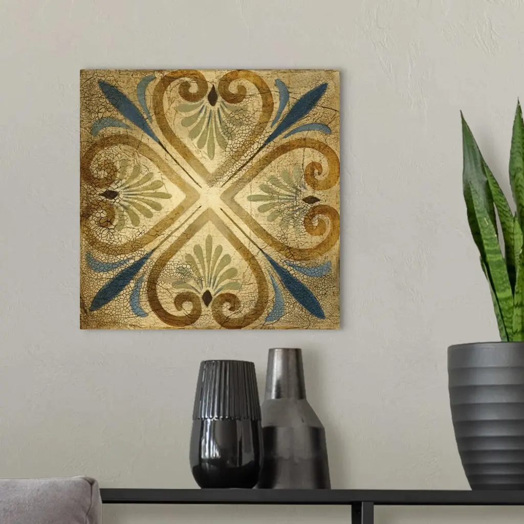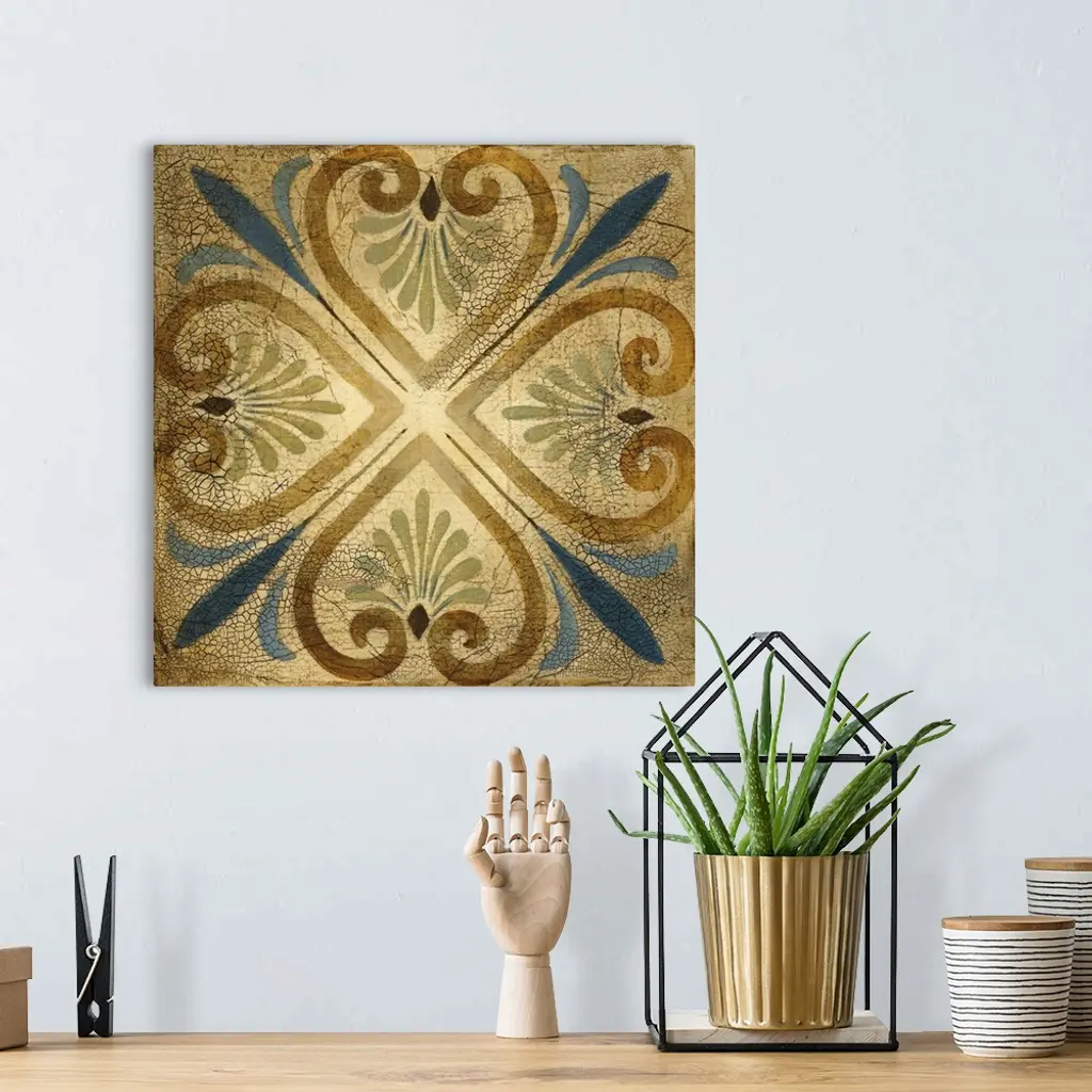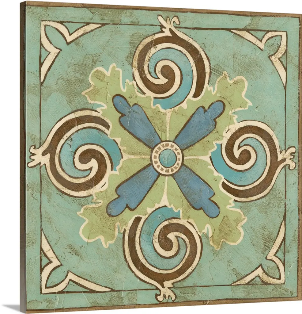 This square shaped decorative accent is inspired by ceramic tiles and part of a series of four wall hangings.