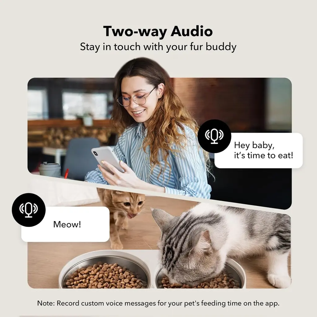 This PetLibro Automatic Dual Pet Feeder has a built-in 1080p HD camera with a 146° wide-angle lens and night vision helps you feel right at home with your pets during mealtimes. Pets love routine, which is why the mealtime call is crucial. The two-way voice system helps you reassure your pets with your voice and hear their happy woofs and meows. Once the motion detector senses movement, the camera records and saves videos of your pets' activities. You'll even get alerts on your phone so you can watch in real time. Plan meal portions, diets, and feeding times from anywhere, right from your phone using the easy-to-use PetLibro app. The patent rotor in the tank base, twist-lock lid, desiccant bag, and sealing strip work together to keep food fresh, while the infrared safety system shuts down the feeder if pesky paws are detected inside the dispenser. Additionally, the low food level reminder alerts you when it's time to refill the feeder.