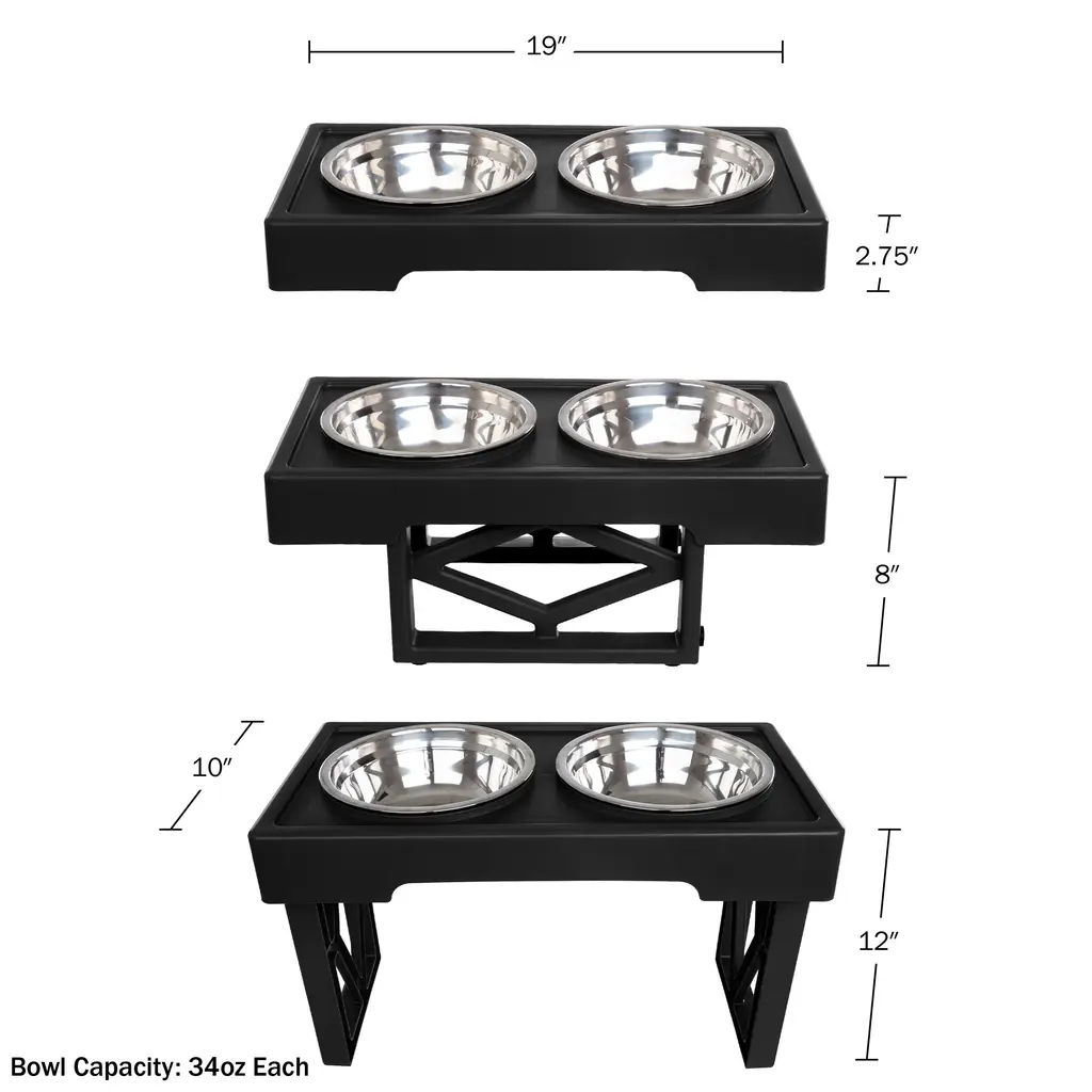 Provide your pet with a comfortable and healthy feeding experience with the Dog Feeder by PETMAKER. This dog bowl stand adjusts to 12-inches, 8-inches, and 2.75-inches in height, perfect for small, medium, and large dogs or to use for a puppy as they grow into adulthood. Each dog bowl can hold up to 34-ounces of food and water and sit in the stand to keep them in place to avoid spills and messes. The legs of this dog food stand easily remove and tuck under the feeding platform for compact storage when traveling. Item Dimensions (L) 19” x (W) 10” x (H) 2.75” - 12” Features