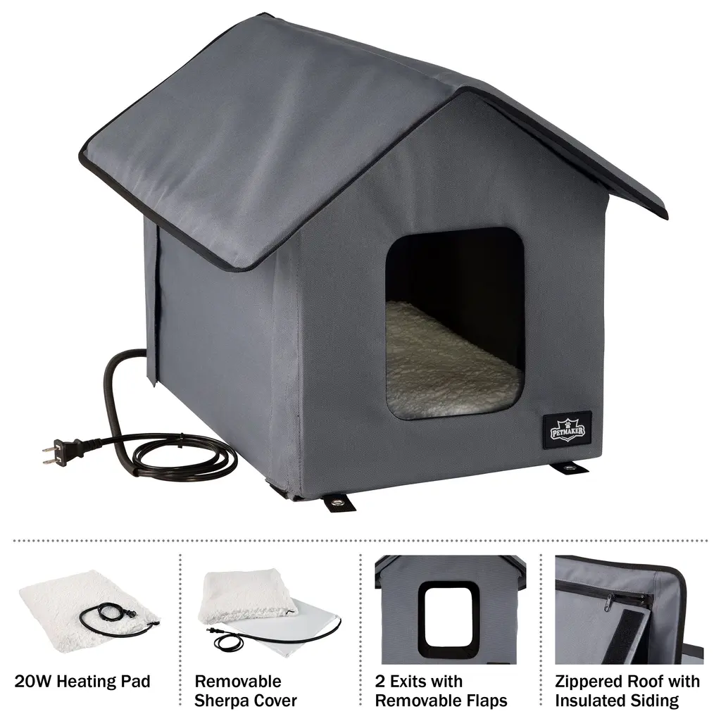 Give your outdoor, indoor, or neighborhood cats a safe and warm space to sleep with the Heated Cat House by PETMAKER. This outdoor cat house comes equipped with a zippered roof, insulated siding, and a 20W cat heating pad with a plush Sherpa cover that all animals will love to curl up to. The cat condo is weather-resistant, and great for use in garages, porches, barns, or even in colder parts of the home. This rabbit house features 2 exits to provide multiple escape routes in case of predators and includes removable clear door flaps to protect your furry friends from the harsh outdoor elements. Item Dimensions (L) 20.5” x (W) 18” x (H) 15.5”. Weight Capacity: 4.35lbs Features