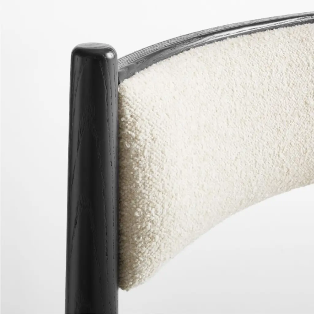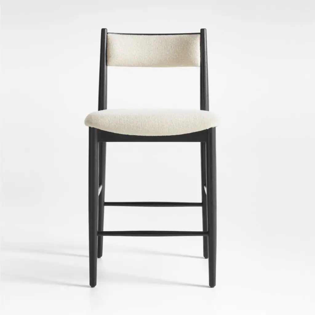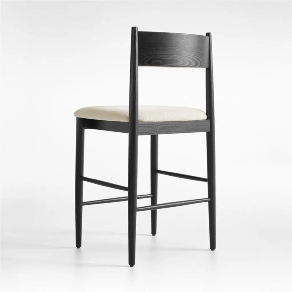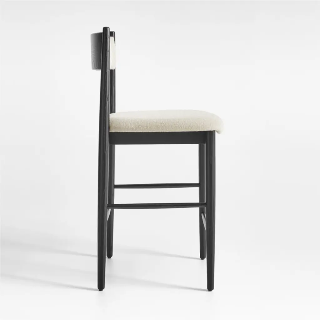 Our Petrie counter stool taps into the same stylish era as our furniture collection of the same name. With its classic mid-century modern silhouette, the black-finished ash stool features subtly tapered turned legs and a barrel-curved backrest. A padded back and cushioned seat that extends slightly beyond the frame soften the look and provide linger-inducing comfort. The ivory performance upholstery textures with a mini boucle-like weave. The perfect update to counter or high-dining, our Petrie charcoal counter stool is a Crate & Barrel exclusive.By choosing FSC ®-certified furniture, you are supporting responsible management of the world's forests.