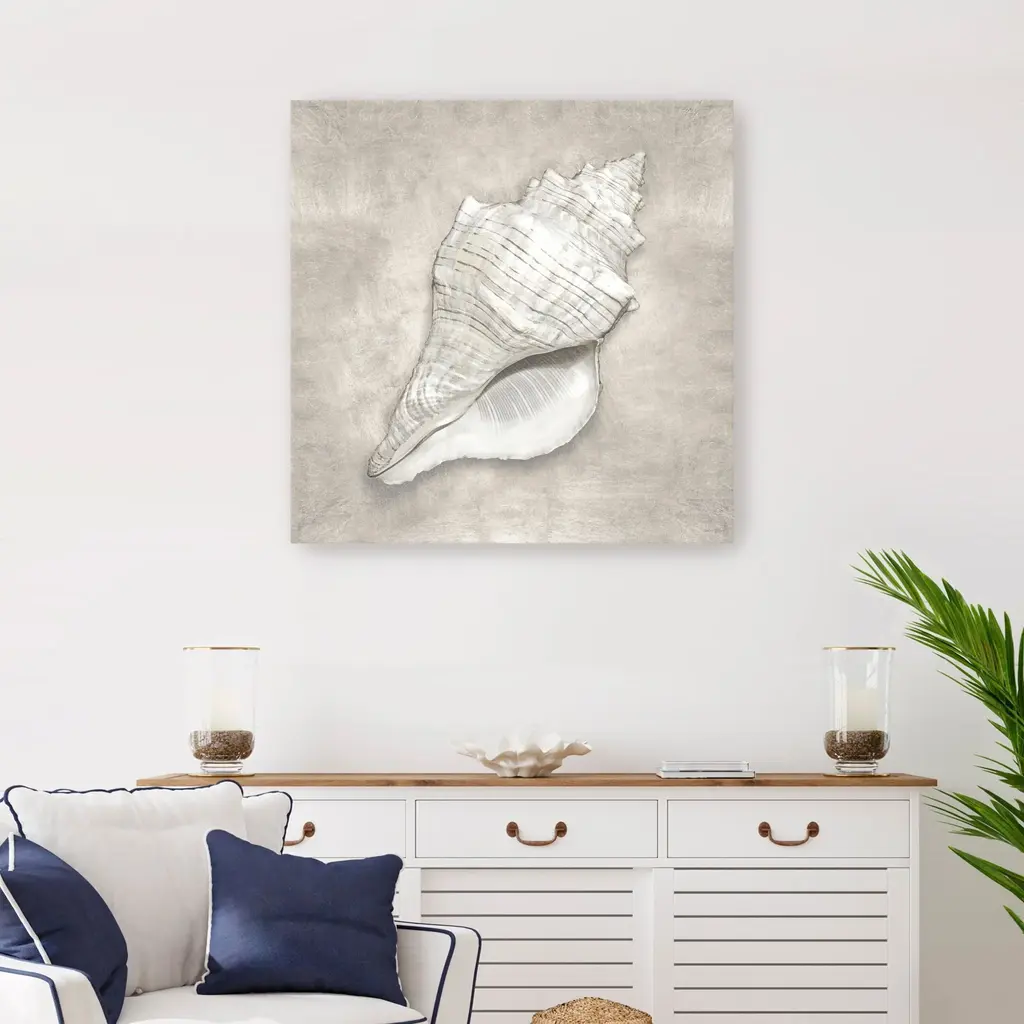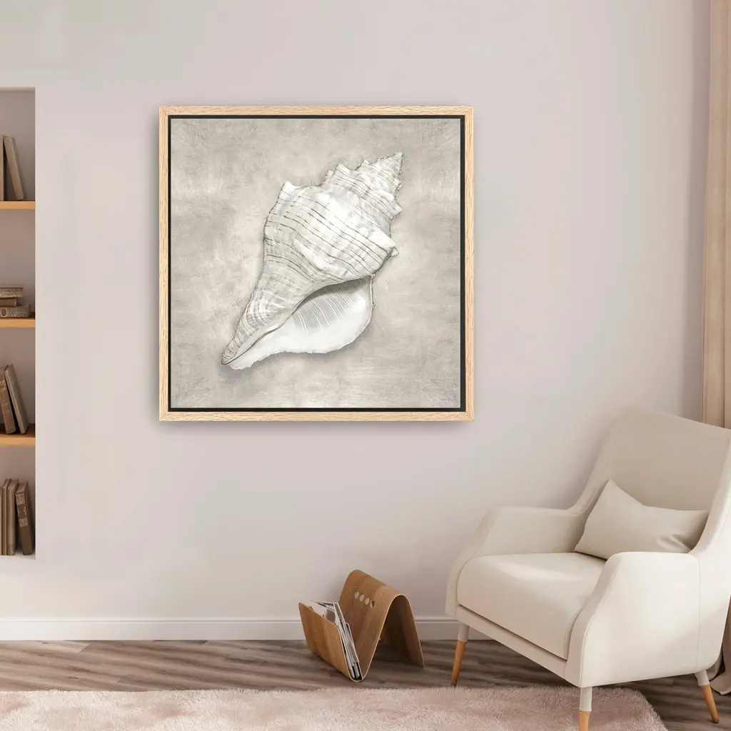Bring the beauty of the ocean into your home with this enchanting canvas art print, featuring an array of delicate sea shells that evoke the tranquility of coastal living. The soft, soothing colors and intricate details create a serene atmosphere, making it a perfect addition to any space.Available in black frame, dark walnut frame and oak frames, or as a frameless canvas. Our Gallery Wrap Canvas Prints are proudly assembled with high quality materials in California, USA. Each piece is printed on a thick, archival grade canvas using Giclee technology. It is then hand-stretched by our experienced artisans over solid pine bars, which will not warp over time. The final product is a piece personally crafted for you to confidently display on your wall. Care and Assembly: Ensure that the location of your piece has little to no exposure to heat, sunlight, and moisture. Wipe clean, only if needed. Each piece includes a sawtooth hanger to hang on your wall horizontally.