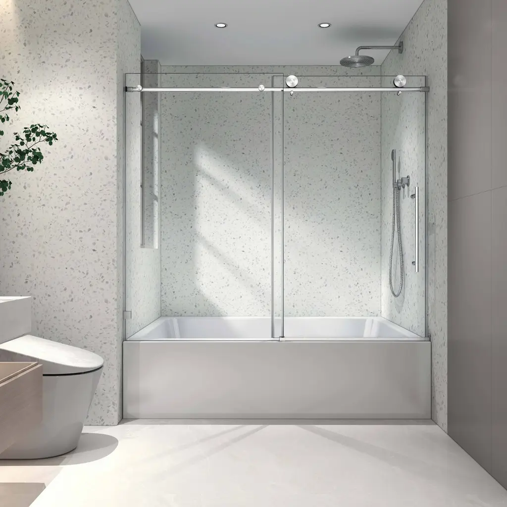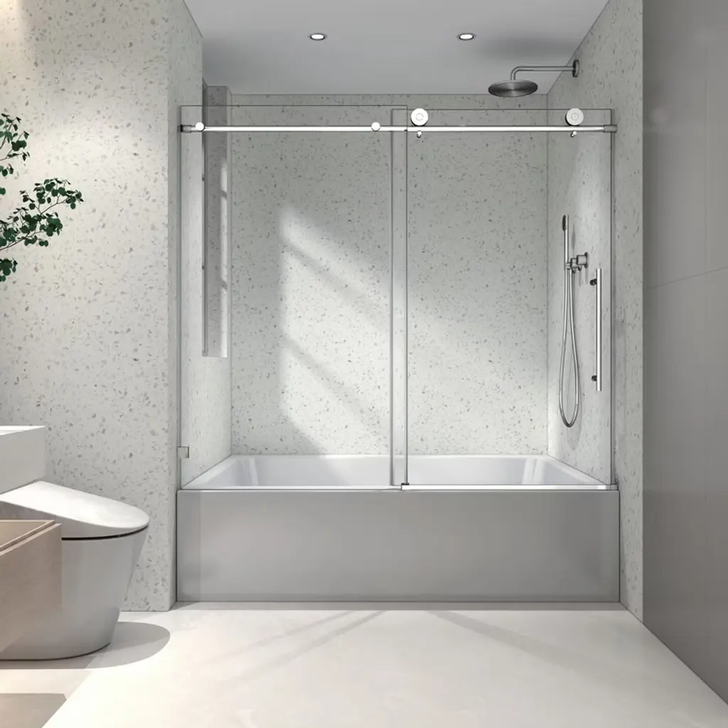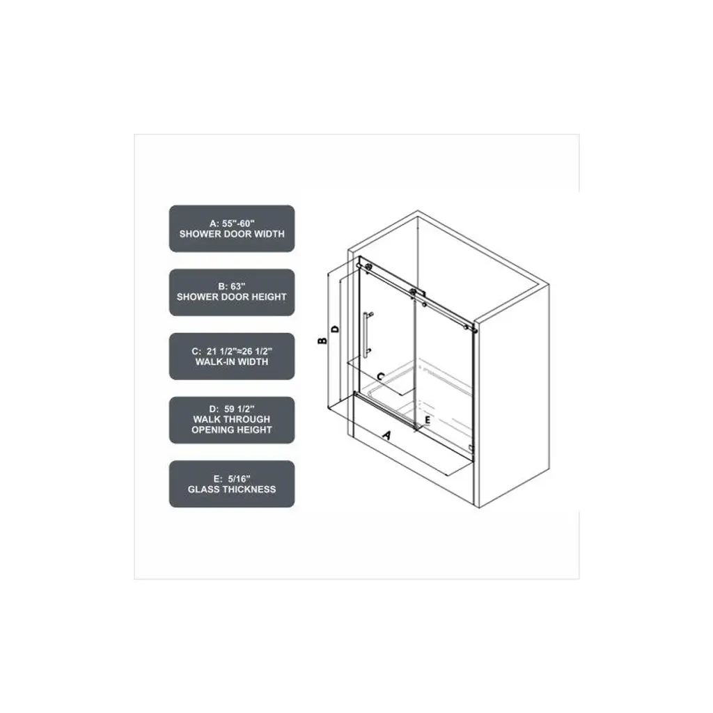 Maximize space and convenience with this one-side sliding shower door, featuring flexible left/right installation and adjustable width (55-60 inches) to fit compact layouts while ensuring smooth operation. Built for lasting performance, its lightweight yet sturdy 8mm tempered glass and high-strength frame withstand 50,000+ test cycles, offering impact resistance and whisper-quiet closing. Enjoy effortless maintenance with a waterproof seal that prevents leaks, combined with a mirror-smooth glass surface that repels stains and keeps your bathroom effortlessly clean and stylish.