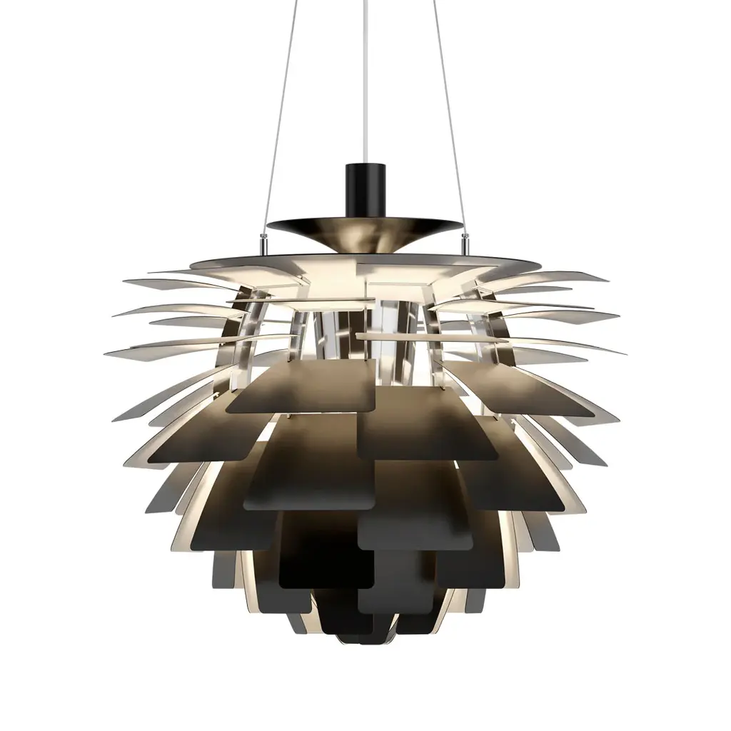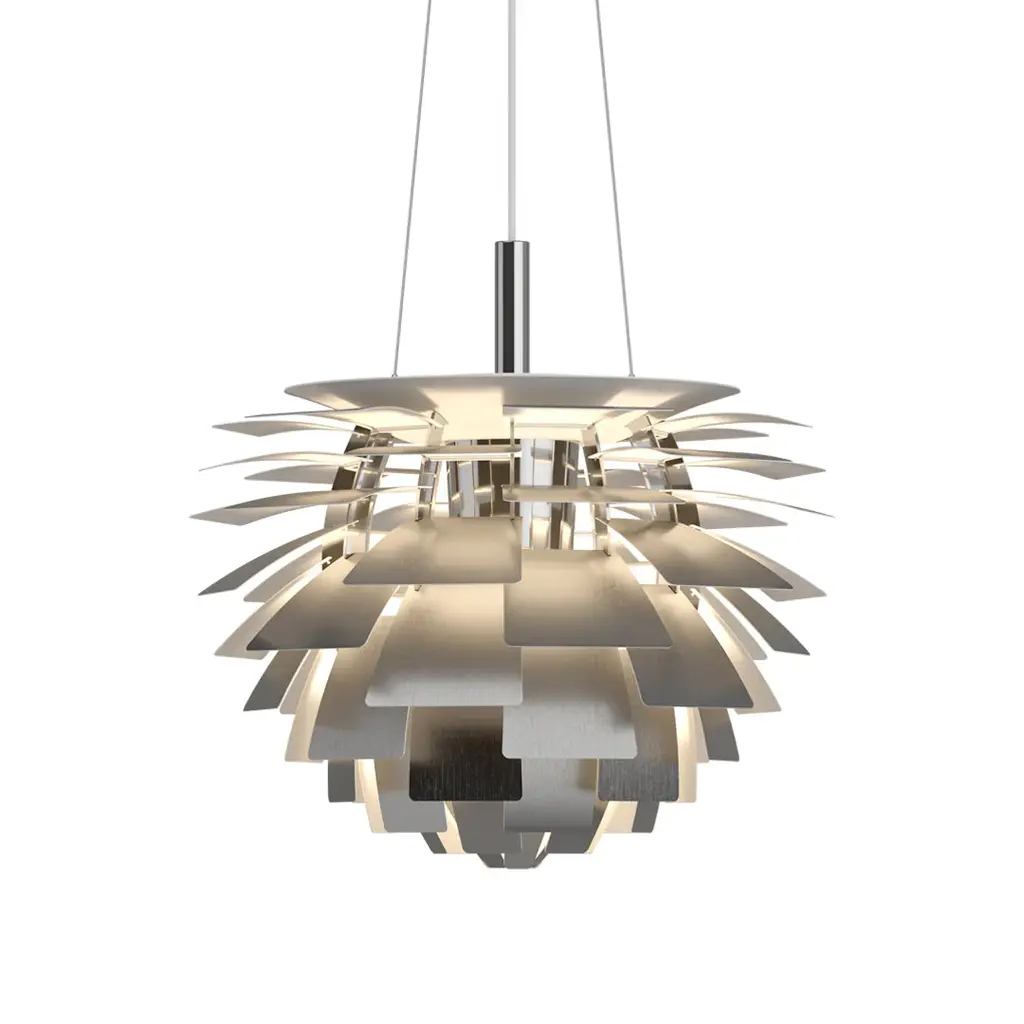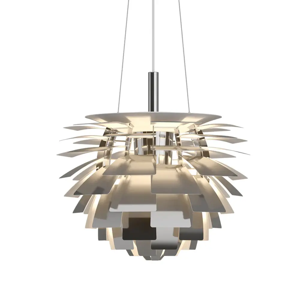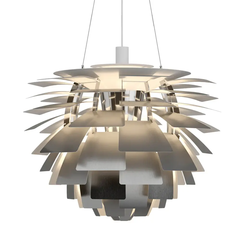 The Louis Poulsen PH Artichoke Pendant Light, designed by Poul Henningsen in 1958, stands as one of the most significant achievements in lighting design history. Originally created for Copenhagen's Langelinie Pavillonen restaurant, where it still illuminates diners today, this masterpiece transforms the principles of illumination into sculptural art. The fixture's genius lies in its precise construction of 72 leaves arranged in 12 unique rows. Each leaf is carefully positioned to achieve Henningsen's vision of completely glare-free illumination from every viewing angle. This intricate arrangement creates a mesmerizing interplay of light and shadow, while concealing the light source within its organic form. Much of the production process remains hand-executed in Denmark, ensuring exceptional craftsmanship in every piece. Available in multiple sizes and finishes – including brushed stainless steel, white painted metal, and the iconic copper with rose interior – the Artichoke adapts to various architectural settings while maintaining its distinctive presence. Larger versions create dramatic statements in grand entryways and double-height spaces, while smaller models offer intimate illumination over dining tables or in living areas. Each PH Artichoke represents Louis Poulsen's commitment to honoring Henningsen's philosophy that shadow is as crucial as light in creating ambiance. The fixture's continued presence in prestigious installations worldwide, including the Museum of Modern Art's permanent collection, affirms its status as both a functional masterpiece and an enduring design icon.