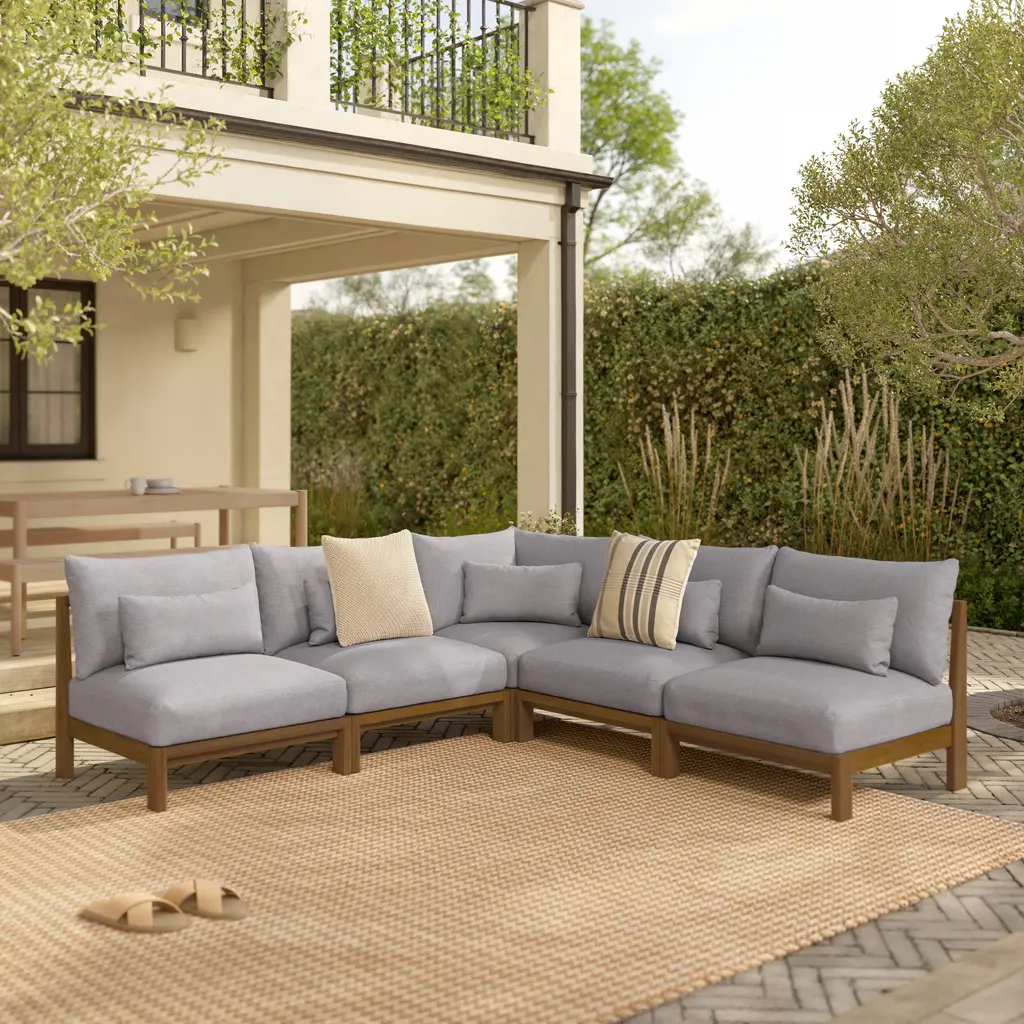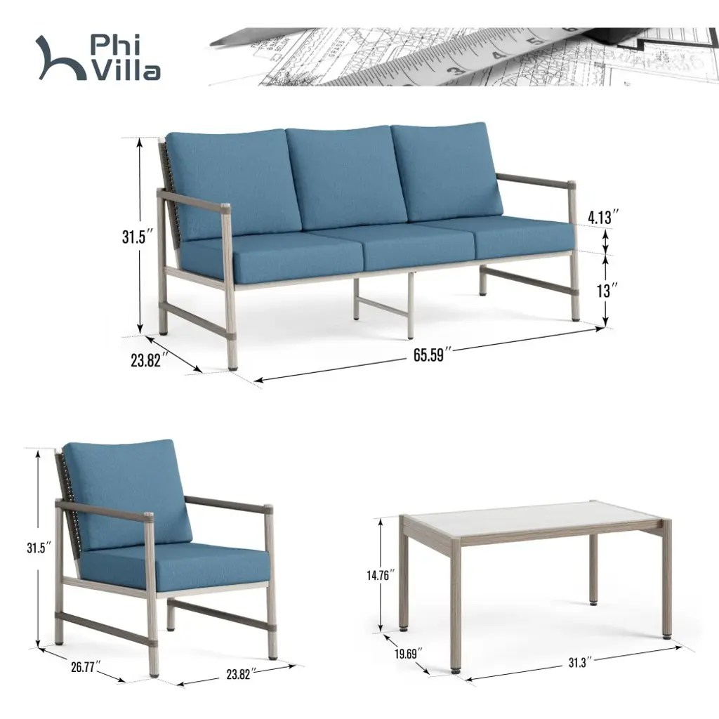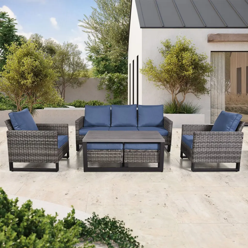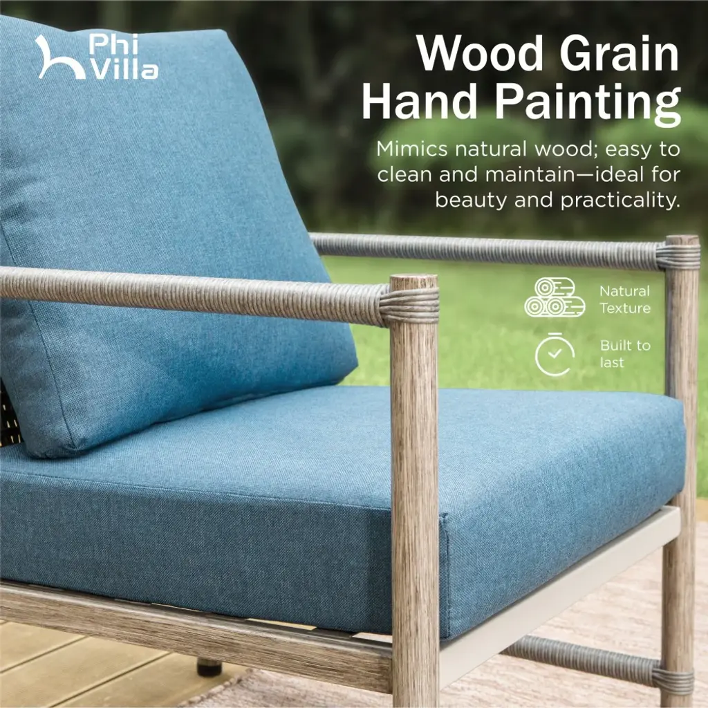 Phi Villa 5/7-Seat Outdoor Steel And Rattan Sofa With Wood Grain Coffee Table