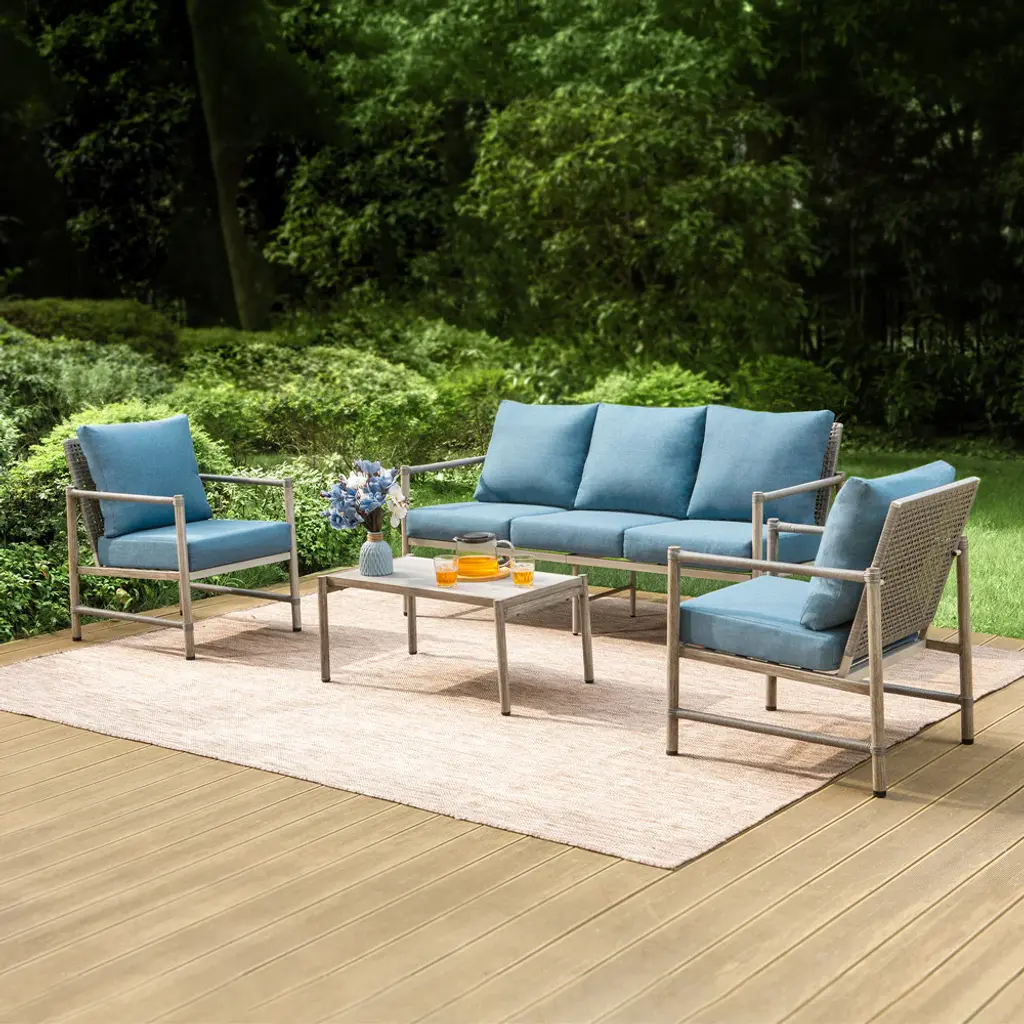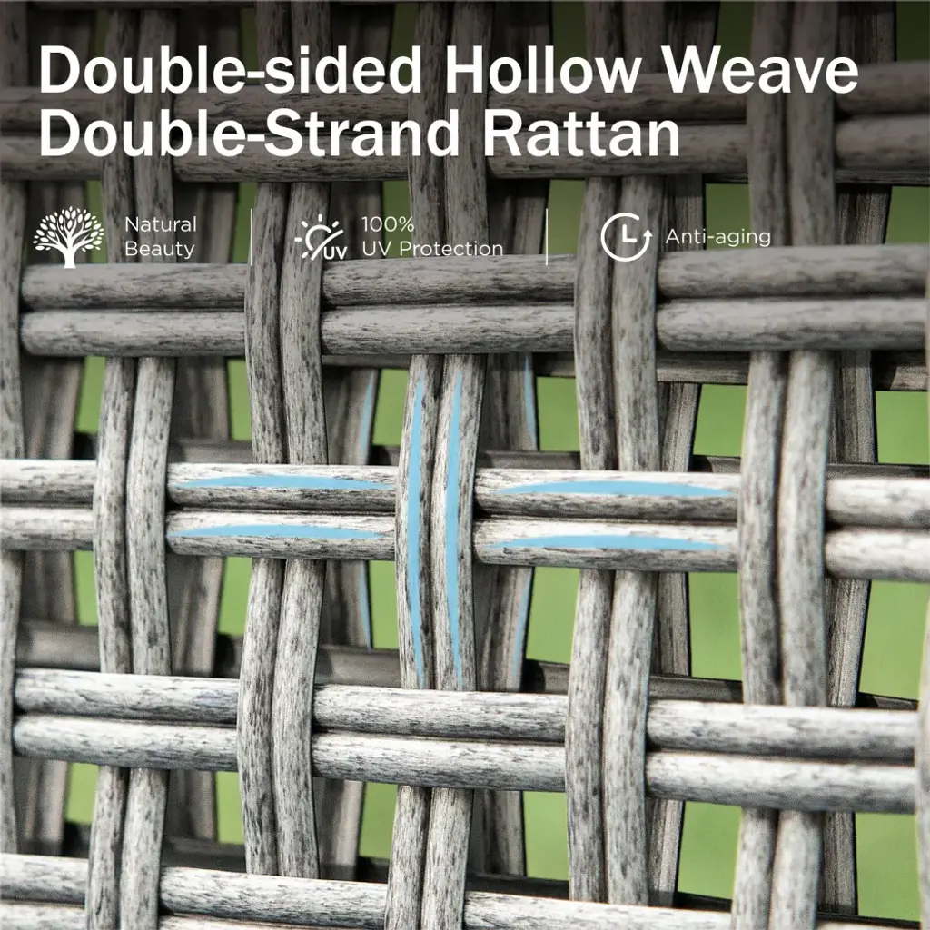 This simple outdoor rattan sofa features double-strand wicker backrests for enhanced aesthetics and comfort. Indulge in the ultimate relaxation experience provided by cushions featuring CUSHION PRO™ technology, while benefiting from the robust construction offered by 1.38'' thickened leg tubes for exceptional support and stability. Pair this with the lightweight and sturdy DPC Wood Grain Coffee Table. Its wear-resistant surface makes it ideal for patios, decks, or balconies, enhancing your outdoor space while offering practicality for everyday use.