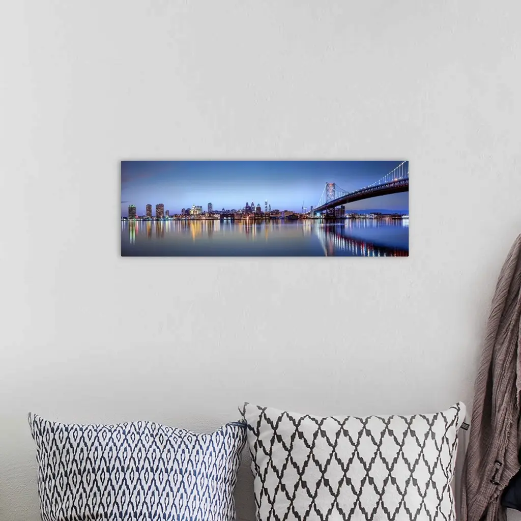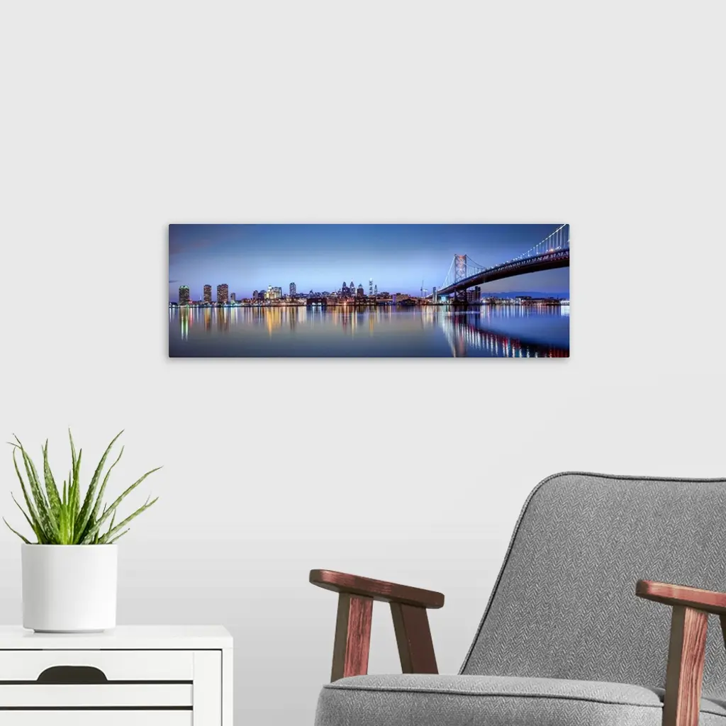 Panoramic photo of the Philadelphia city skyline reflected in the water at night, with the Benjamin Franklin Bridge on the right.