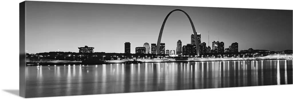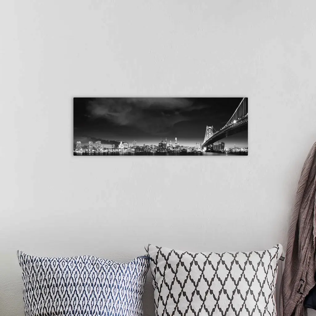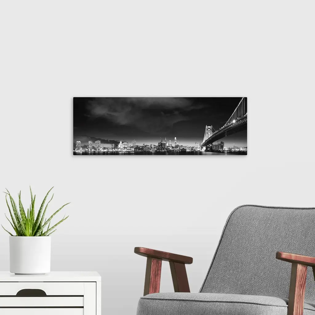 Philadelphia City Skyline At Night With Benjamin Franklin Bridge, Black And White
