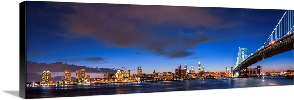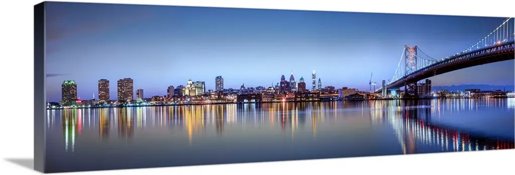 Panoramic photo of the Philadelphia city skyline at night, with the Benjamin Franklin Bridge on the right.