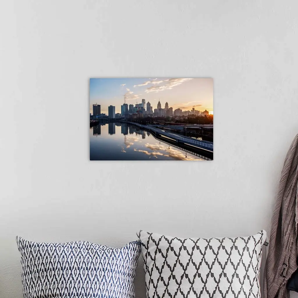 The sun rises above Philadelphia's city skyline with the sky reflecting on the Delaware river.