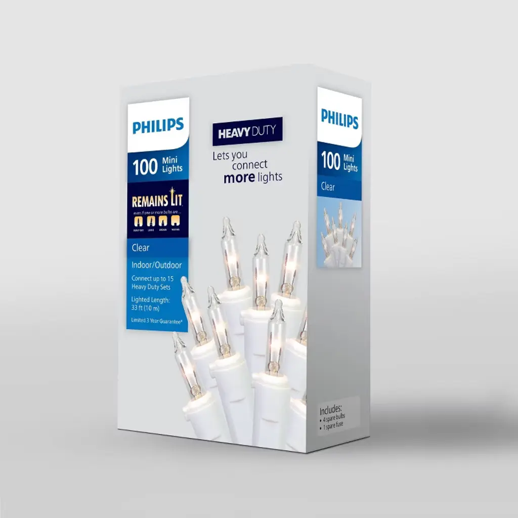 Make your outdoor decorating a snap with these Philips Heavy Duty 100CT Mini Lights in clear color with white wire. Made with remains lit technology, if one bulb burns out or breaks, the rest of light string remains lit.. Strings have a lighted length of 33' and a total of 15 sets can be connected end to end for a total of 1,500 bulbs, twice as many as regular light strings. Bulbs are twist resistant and have lamp lock for added security.
