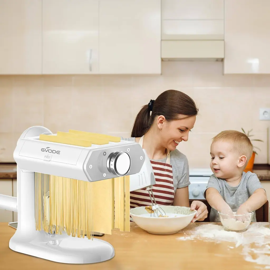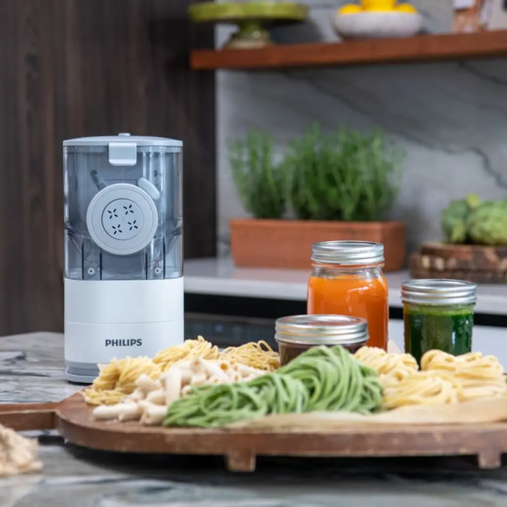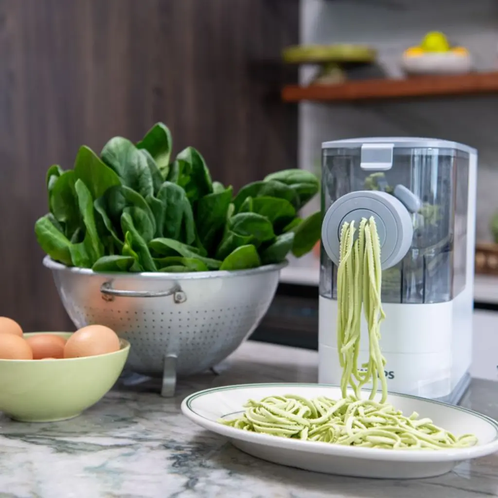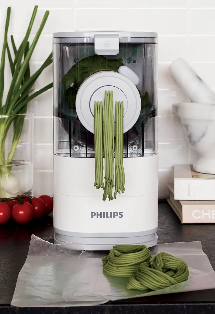 Making fresh pasta is an everyday affair with this fully automatic pasta maker. Add the flour (semolina, spelt, whole wheat) and liquid (vegetable juice, eggs, water) of your choice, choose your pasta shape (spaghetti, penne, fettuccine), and let the bright white machine work its magic. The clear housing provides a fascinating view of the stirring bar and kneading tube creating perfect dough that is then double extruded for the smoothest pasta, all in just 18 minutes. With its compact size, small footprint and incorporated storage drawer, this pasta maker fits easily in cabinetsor on the countertop for fresh pasta every day.