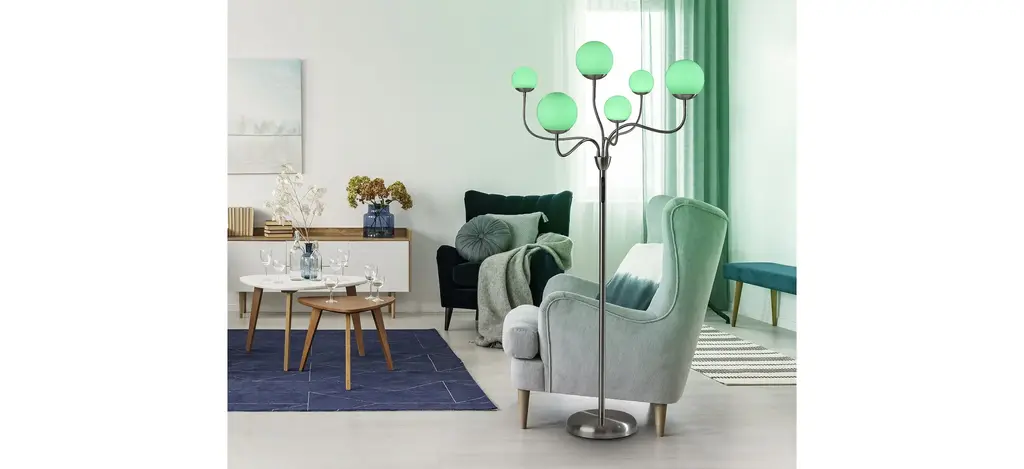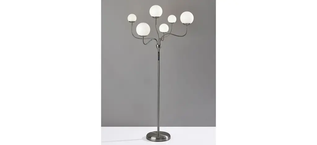 With a contemporary, versatile design and sleek color-changing LED functionality, the 64" tall Phoebe LED Color Changing Floor Lamp is the ideal addition to bedrooms or living spaces. It features a round, 11" diameter brushed steel base supporting a matching thin, tall pole. Branching from the pole are six adjustable arms that can be twisted and angled in any number of ways to create a design to suit the needs of your room. At the end of each arm is a white plastic globe, three of which are large and three of which are small for a unique look. The globes house cost-saving 2W integrated LED lights that are easy to adjust and provide a full spectrum of color options. A touch switch with a 3-step dimmer is located on the pole, giving you the ability to set the brightness and lighting color to suit your mood.