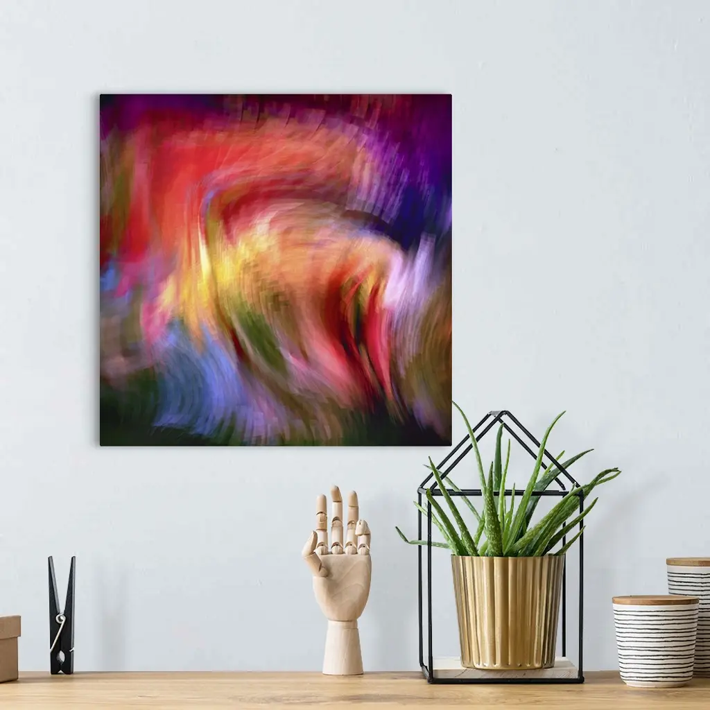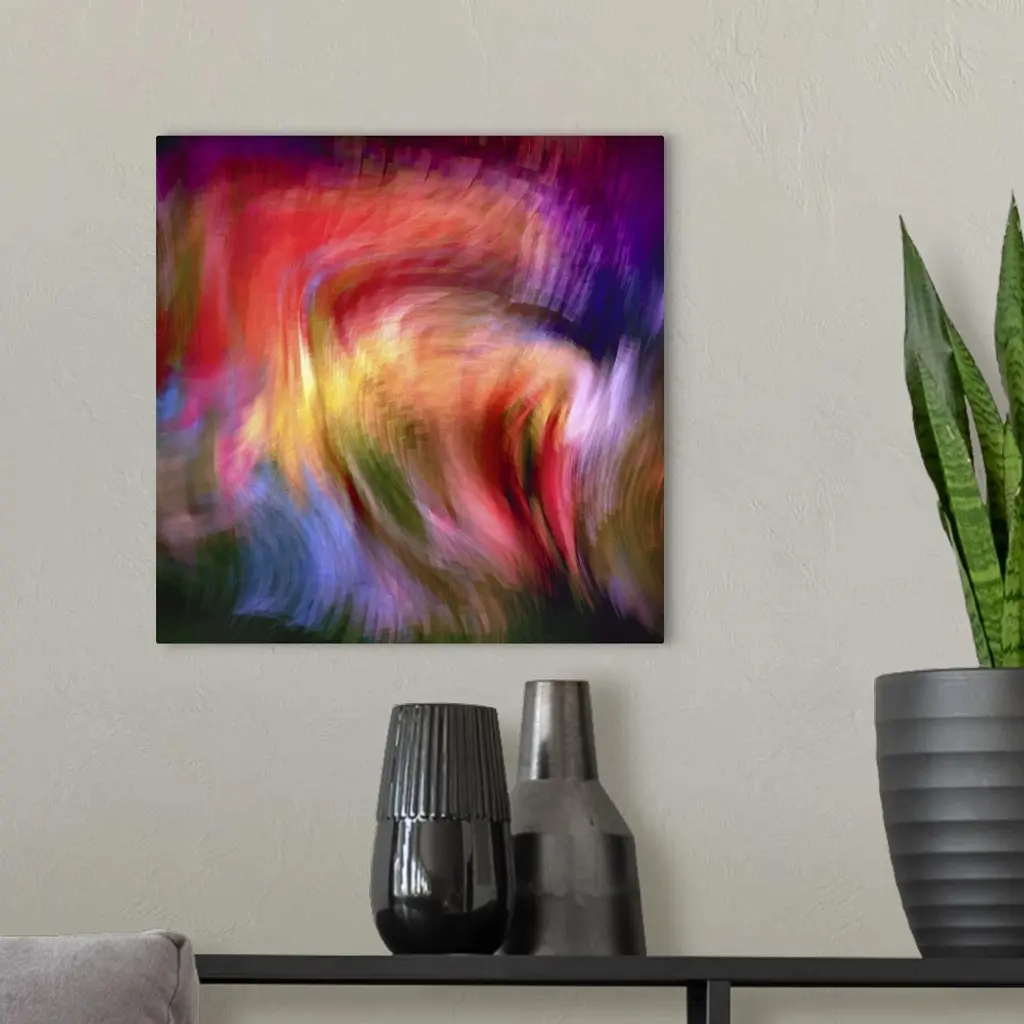 Bright pink, yellow, purple, blue, and green lights from a city scene warped into abstract shapes to create a mosaic-like image.