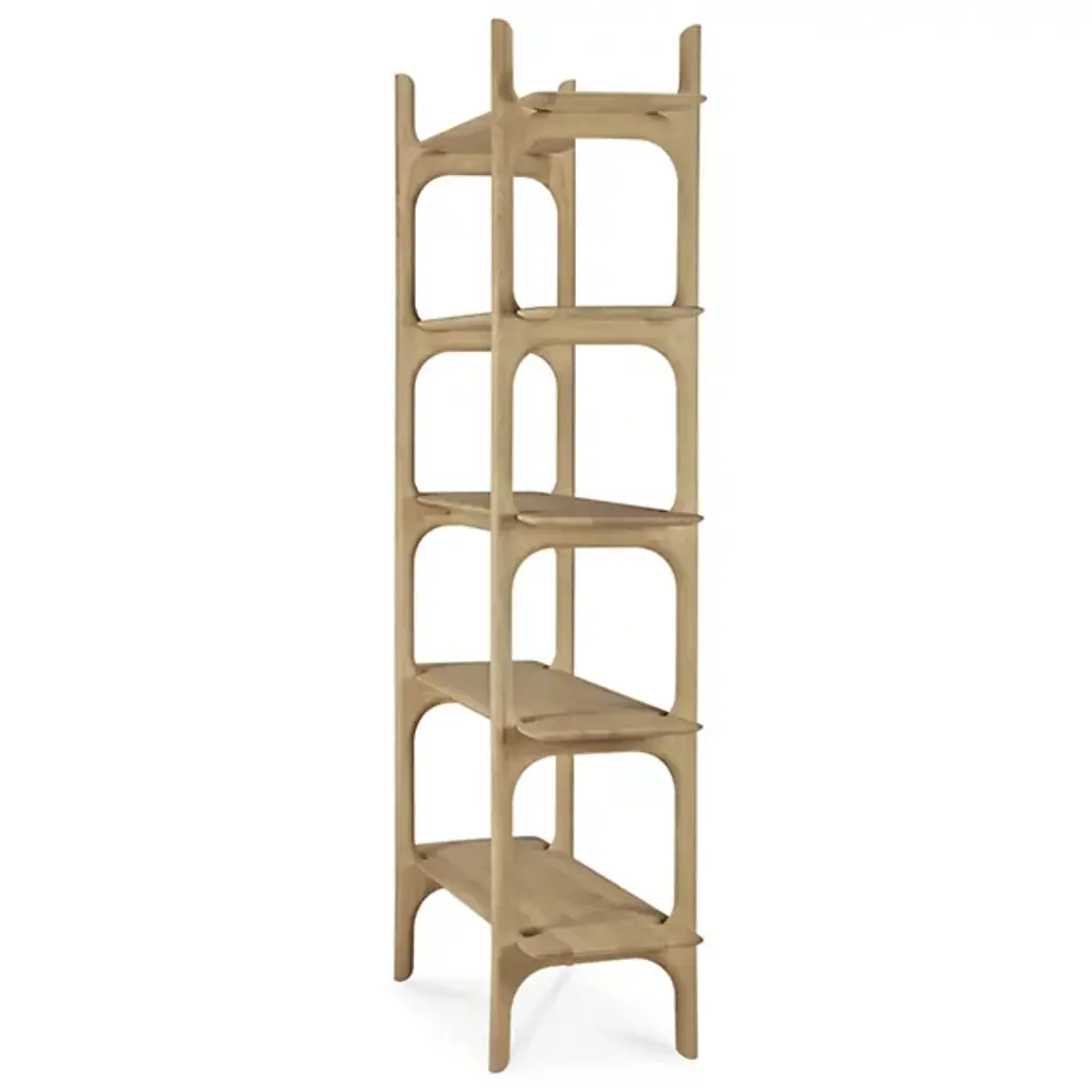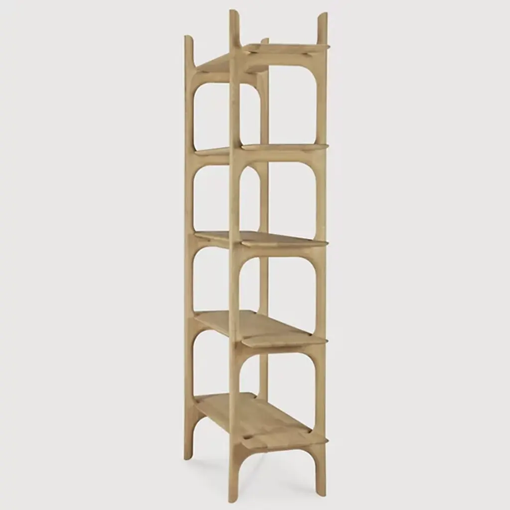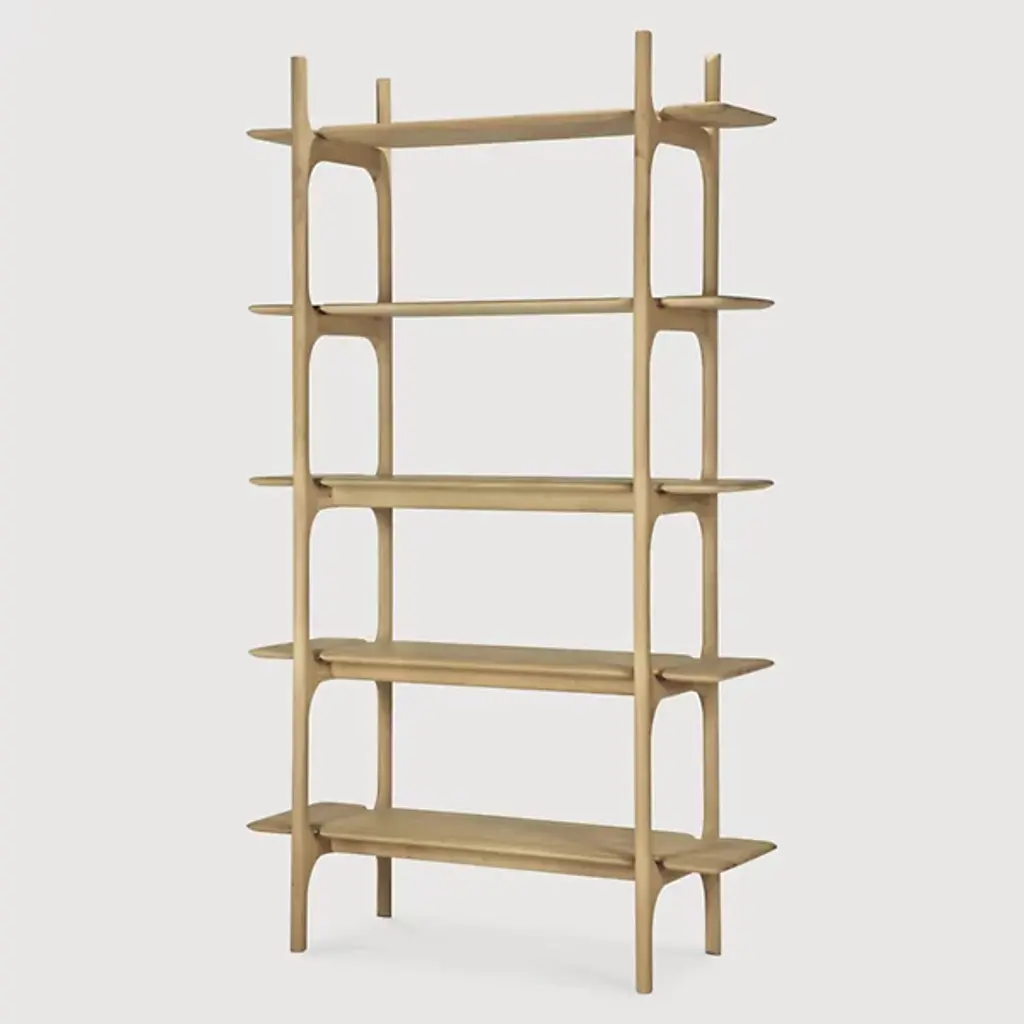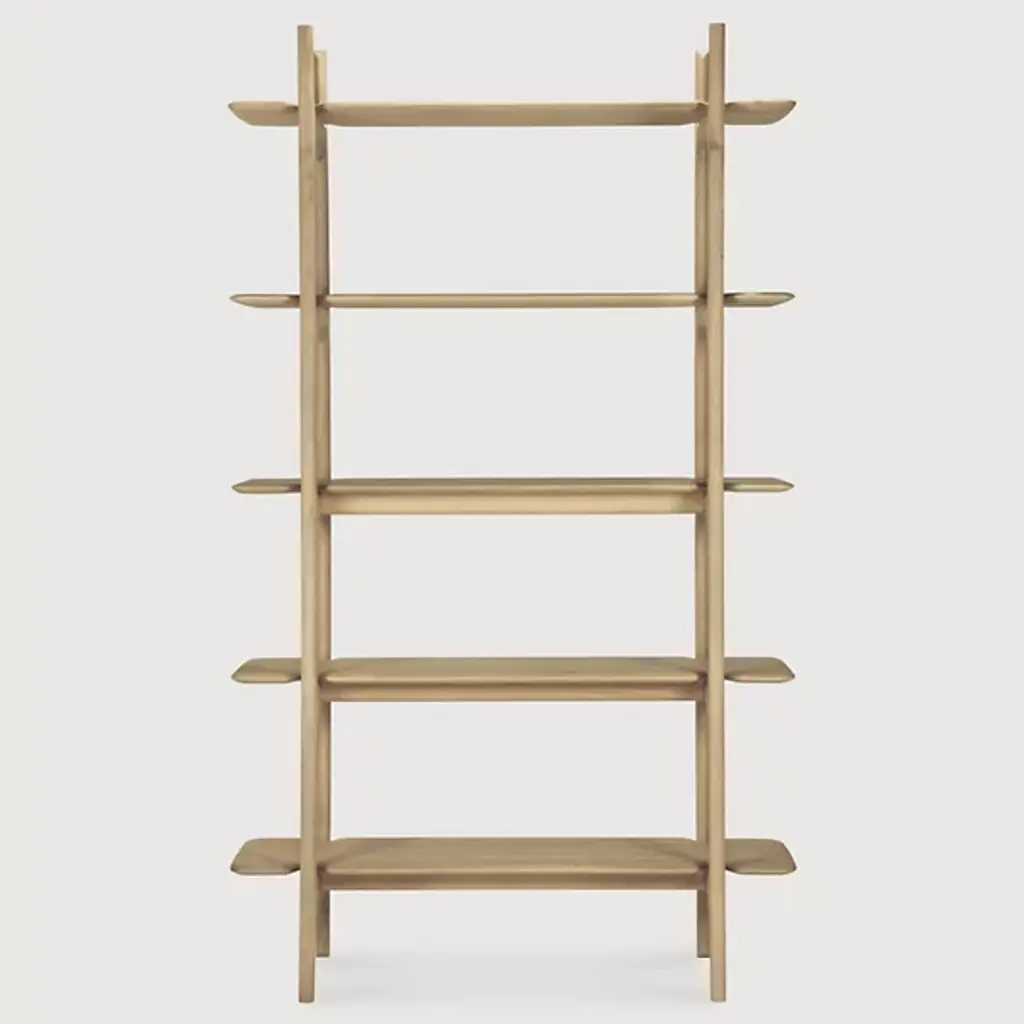 The PI Rack from Ethnicraft brings nature's organic patterns into functional design. Five graduated shelves, supported by crossbeam construction, provide ample space for books, artifacts, and treasured objects. The handcrafted details celebrate the wood's natural characteristics, with each piece individually finished to preserve its distinct grain patterns. Designed by Alain Van Havre, the sturdy vertical supports of this rack ensure stability without compromising the airy feel.