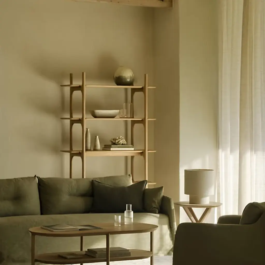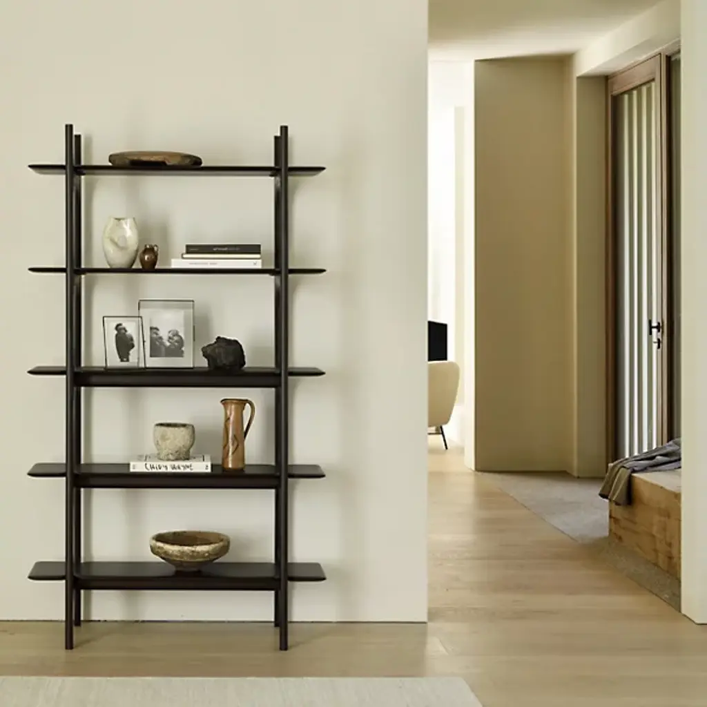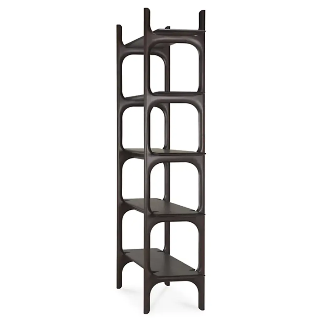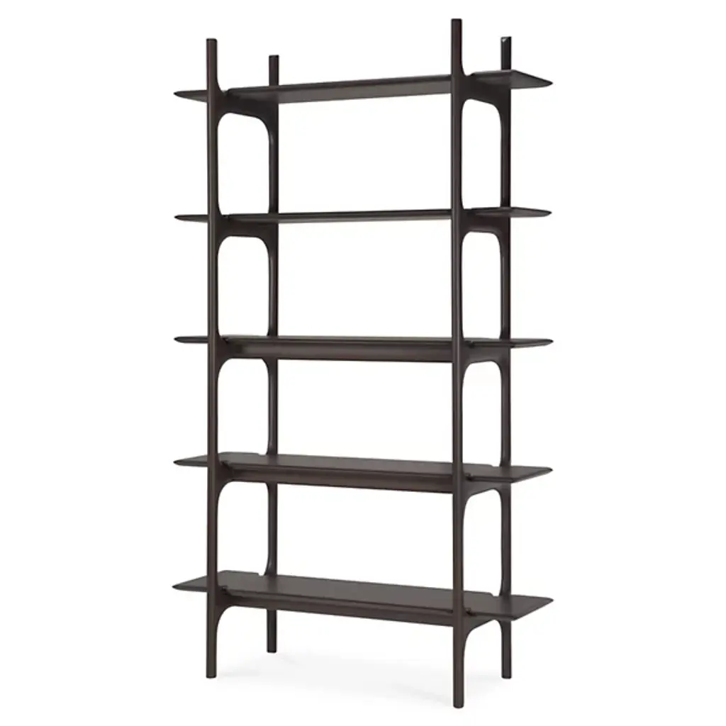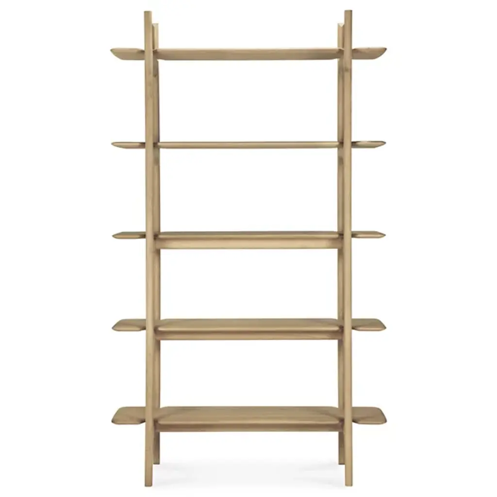 The PI Rack from Ethnicraft brings nature's organic patterns into functional design. Five graduated shelves, supported by crossbeam construction, provide ample space for books, artifacts, and treasured objects. The handcrafted details celebrate the wood's natural characteristics, with each piece individually finished to preserve its distinct grain patterns. Designed by Alain Van Havre, the sturdy vertical supports of this rack ensure stability without compromising the airy feel.