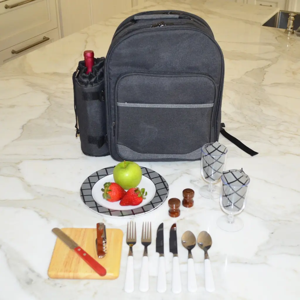 Fully equipped picnic Backpack for two with silver hardware and white accents. Convenient detachable wine holder and thermal shield insulated cooler compartment to keep food and drink at the perfect temperature. Includes combination corkscrew, hardwood cutting board, cheese cutter, wood salt and pepper shakers with non spill tops, acrylic wine glasses, melamine plates, stainless steel flatware, and napkins. Constructed of 600D polycanvas Product Features: Adjustable StrapMaterial: PolyesterColor: Blue