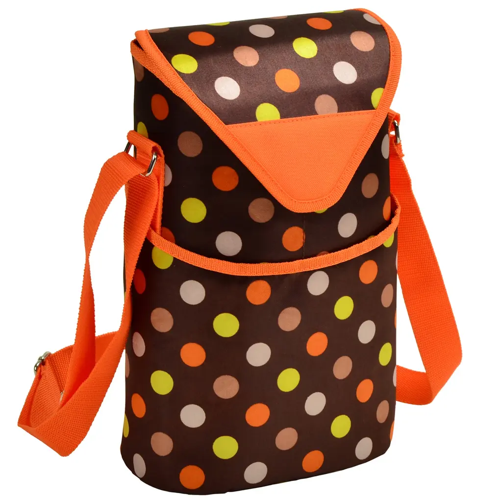 Double bottle carrier from our Julia Dot Collection, is sporty and stylish. It features Thermal Shield insulation, a PEVA waterproof lining, padded divider to separate bottles, and an adjustable shoulder strap for easy carrying. hook and loop closure. Front pocket. Designed in the USA. Lifetime Warranty.