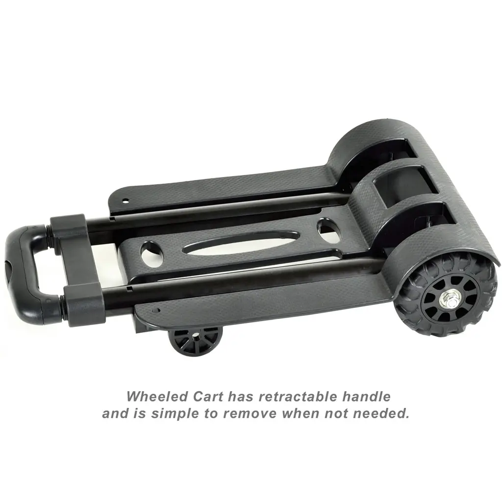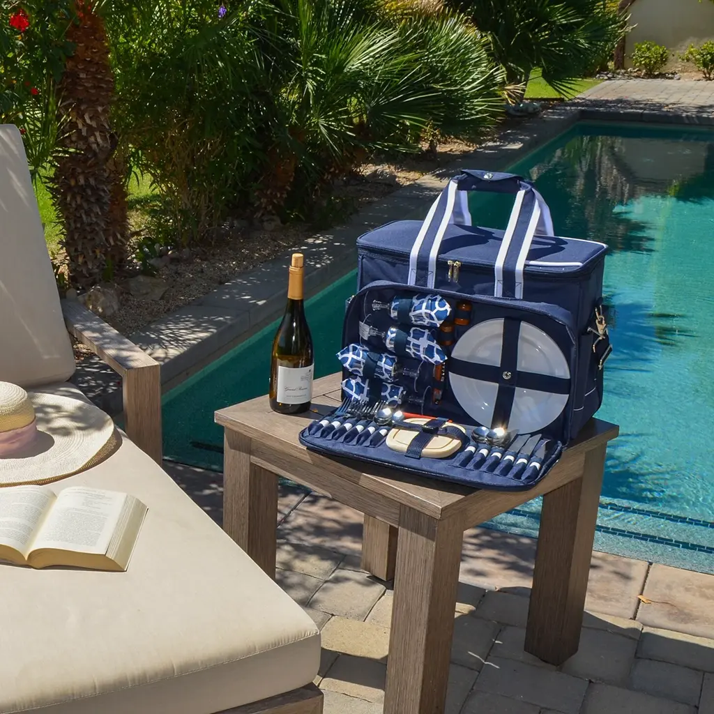 Deluxe Picnic cooler with service for four with removable wheeled cart from our Bold Collection. Sophisticated yet very practical--this unique, Thermal Shield insulated and waterproof, divided cooler compartment allows for drinks to be kept on ice, while food stays cool and dry. Includes 1 each combination corkscrew, hardwood cutting board with juice groove, cheese knife, wooden salt & pepper shakers with non spill tops, and 4 each acrylic wine glasses, coordinating melamine plates, stainless steel flatware and cotton napkins. Easy access to beverages through zippered opening in lid. Designed and assembled in the USA. Lifetime Warranty.