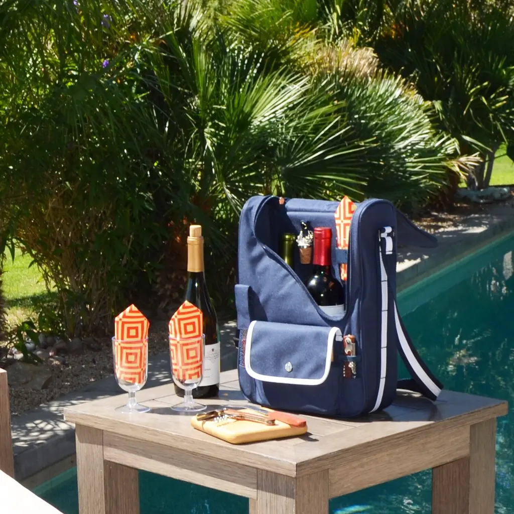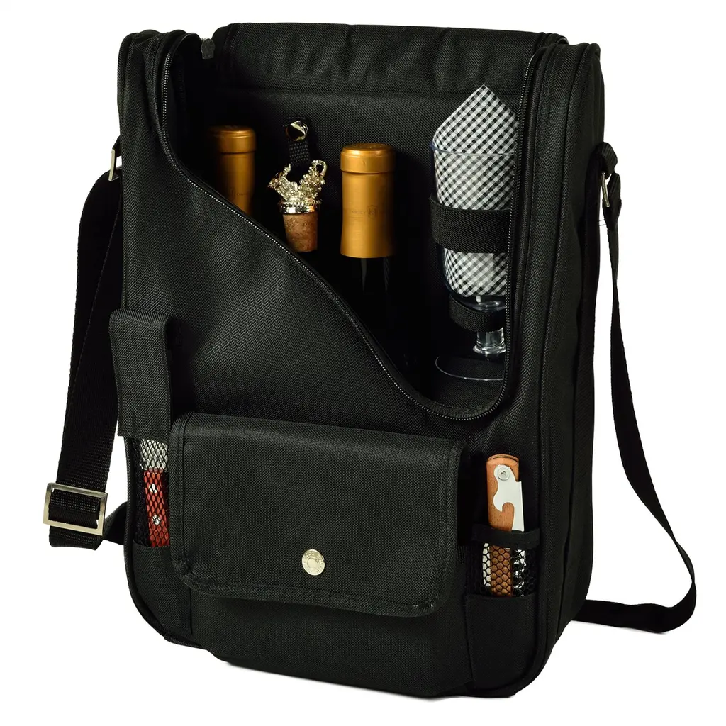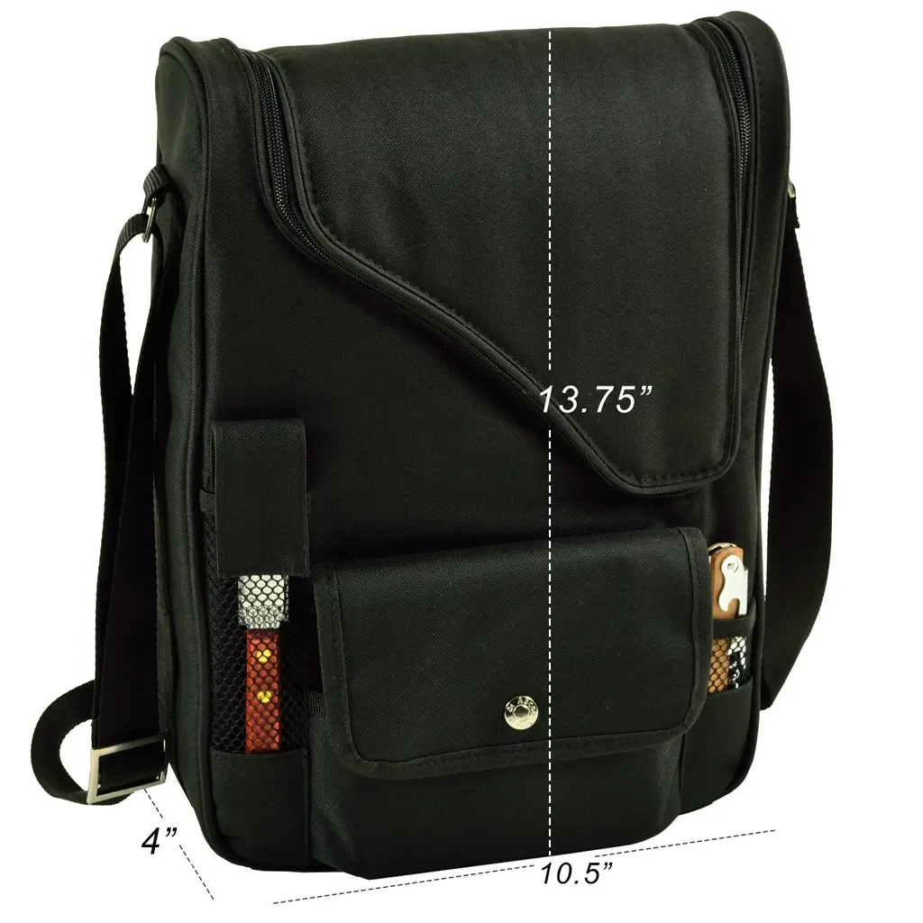 Bordeaux Wine & Cheese Cooler with Thermal Shield insulation is a creatively designed carrier which includes real glass wine glasses, napkins, a corkscrew, bottle stopper, cheese knife, and hardwood cutting board. This unique set holds two bottles and can be used as a three bottle carrier with glasses removed. Includes adjustable padded bottle dividers and padded divider between glasses for protection. The attractive slim profile case has a comfortable adjustable shoulder strap to carry. Designed and Assembled in the USA. Lifetime Warranty.