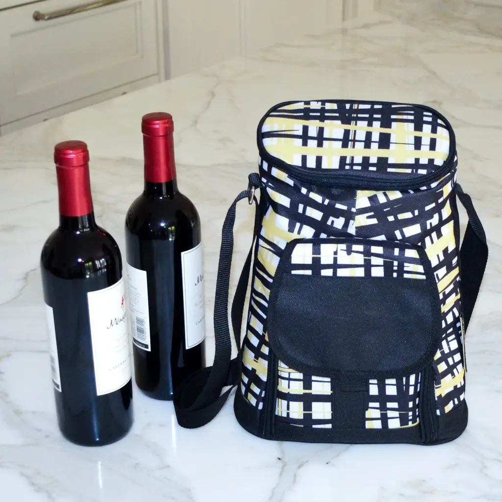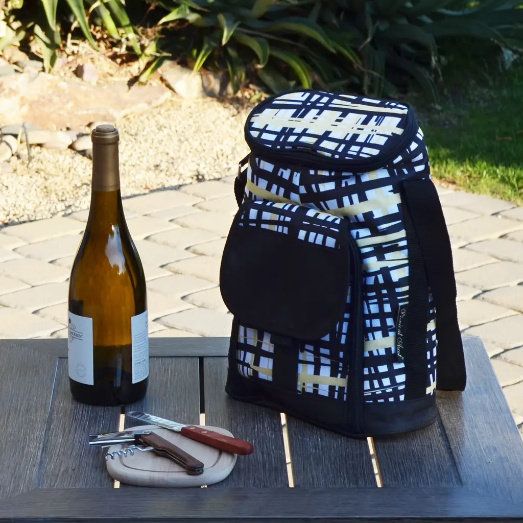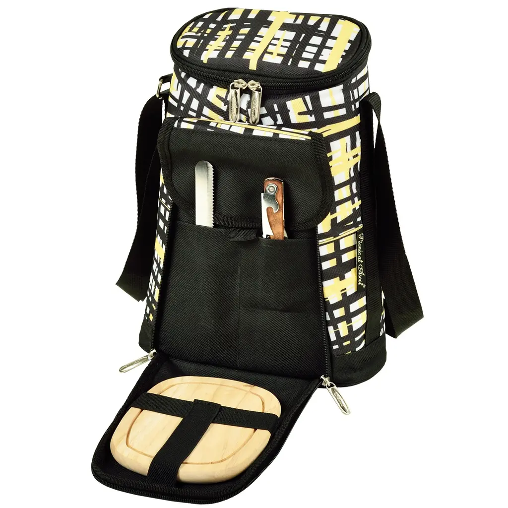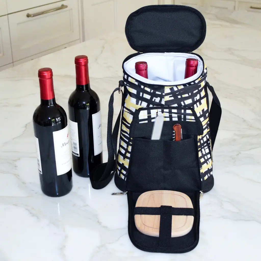 Thermal Shield Insulated wine tote bag with leak-proof lining from our Paris Collection. Movable padded interior divider allows room for larger bottles or for use as a small cooler. Includes cutting board, cheese knife and corkscrew. Adjustable shoulder strap. Designed and Assembled in the USA. Lifetime Warranty.