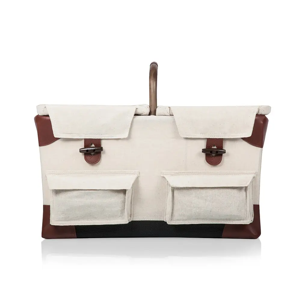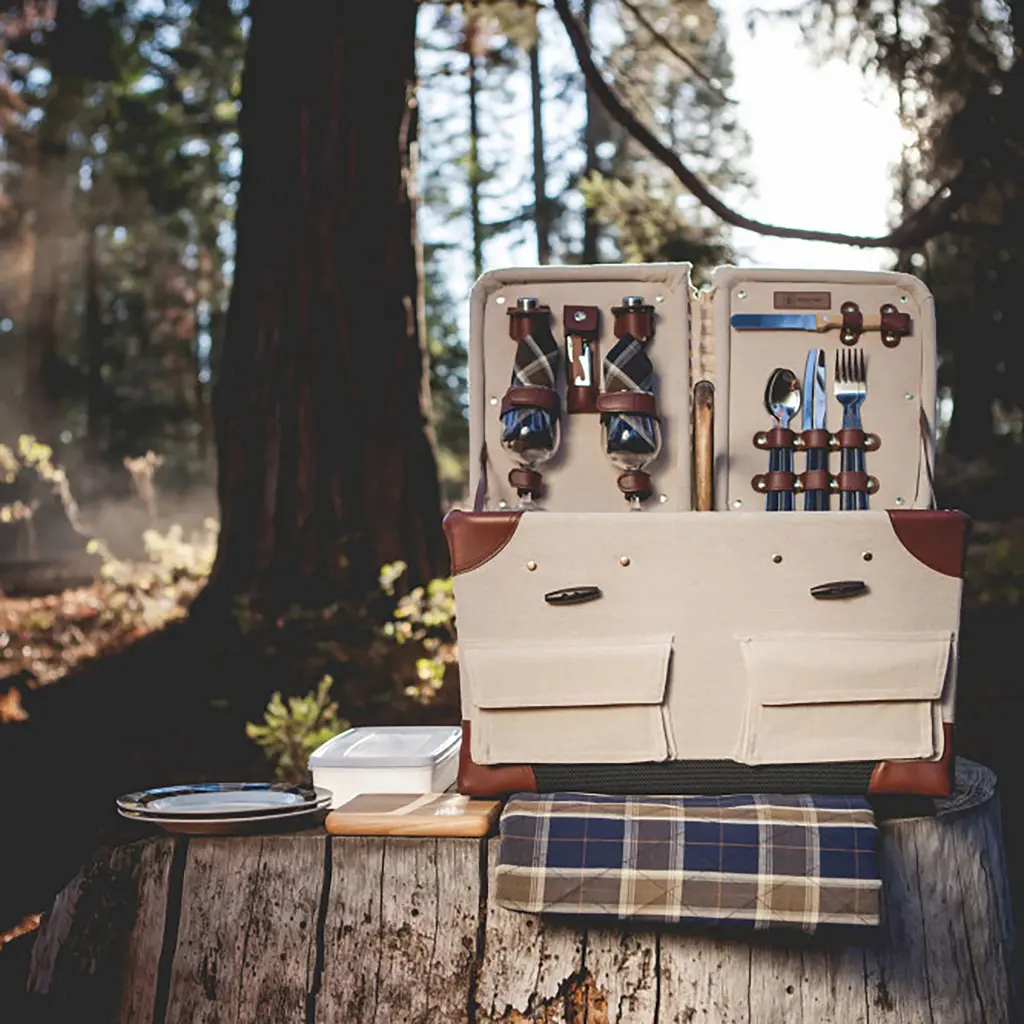 Enjoy a picnic for two with ease. Lightweight and easy to carry. Secure all the tools and utensils with the helpful straps. Includes all the essentials from serving tools and cutting boards to napkins and a blanket.