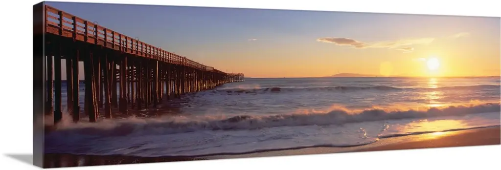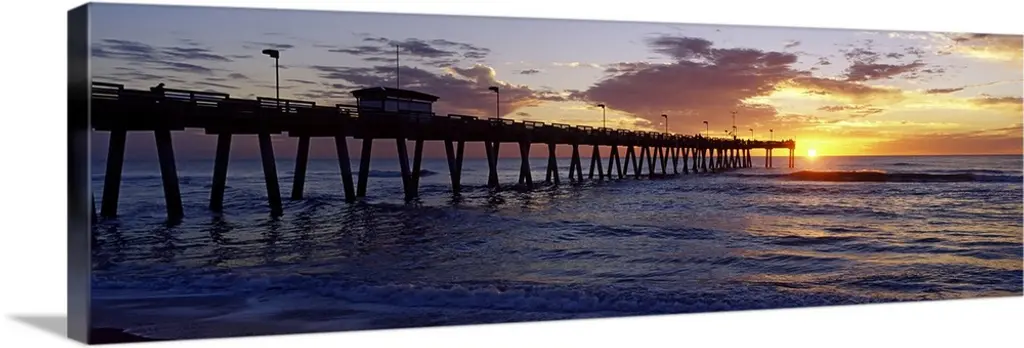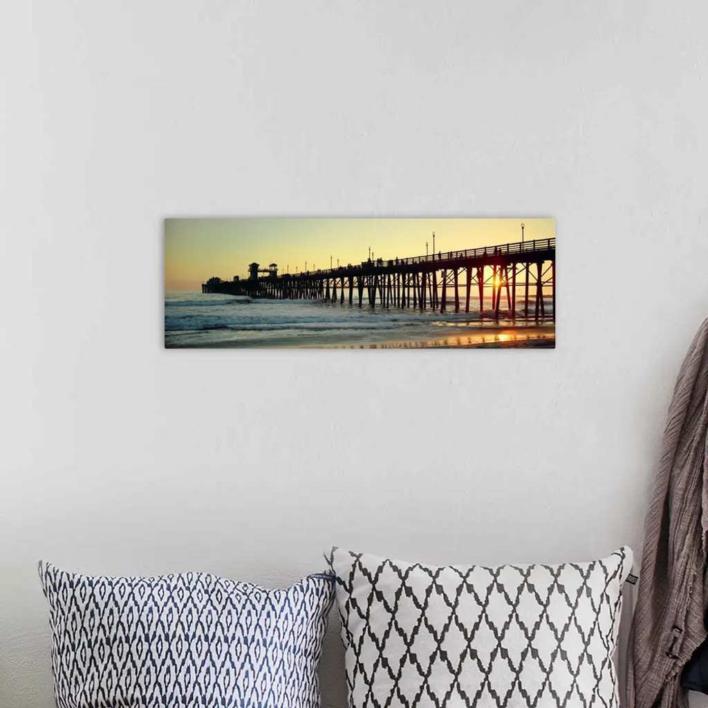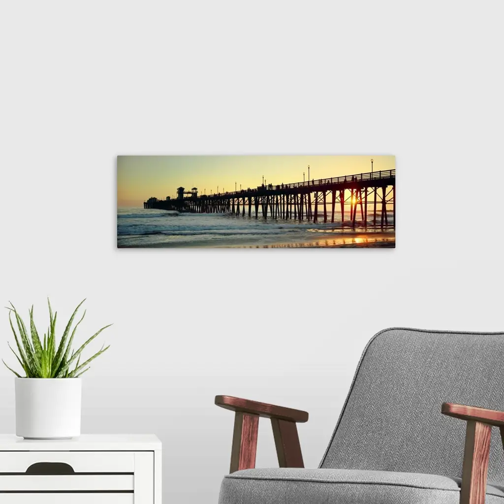 Panoramic wall docor of the silhouette of a pier reaching into the ocean surf at sunset.