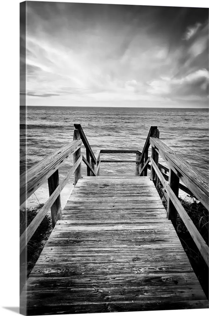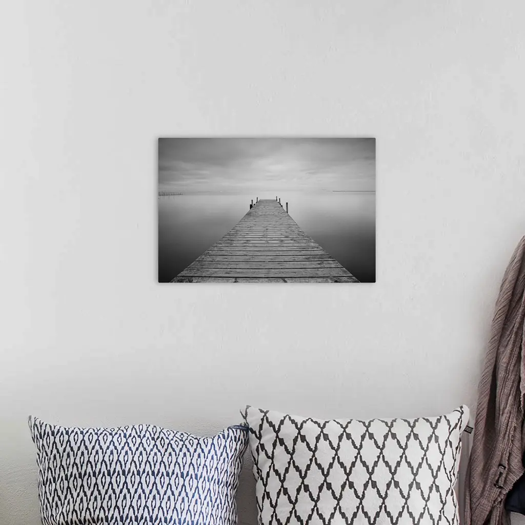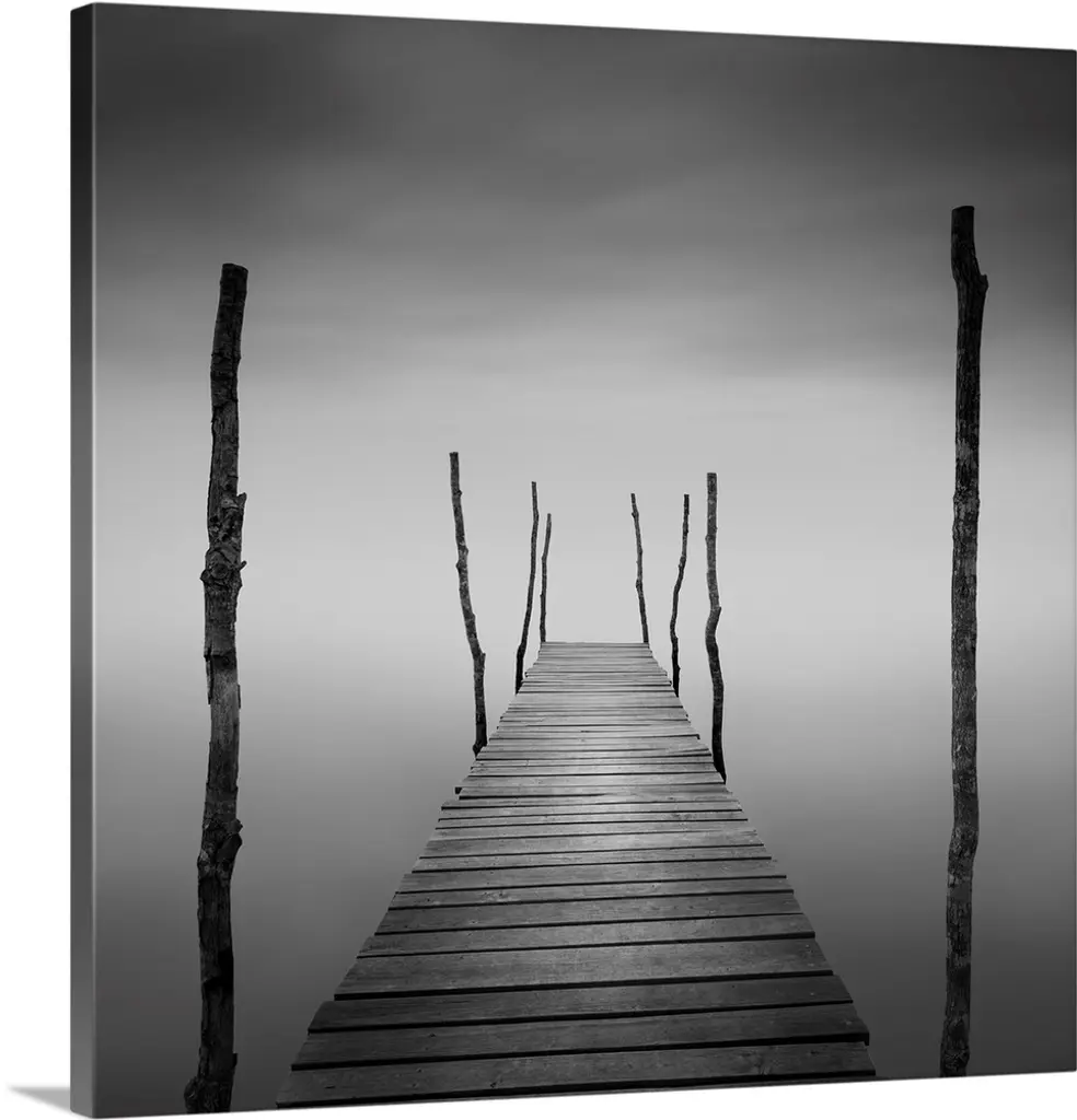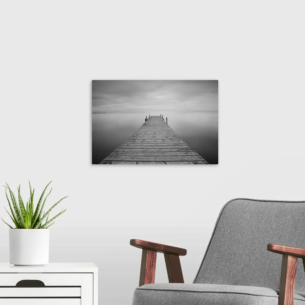 Pier on lake black and white image.