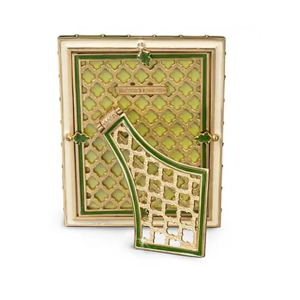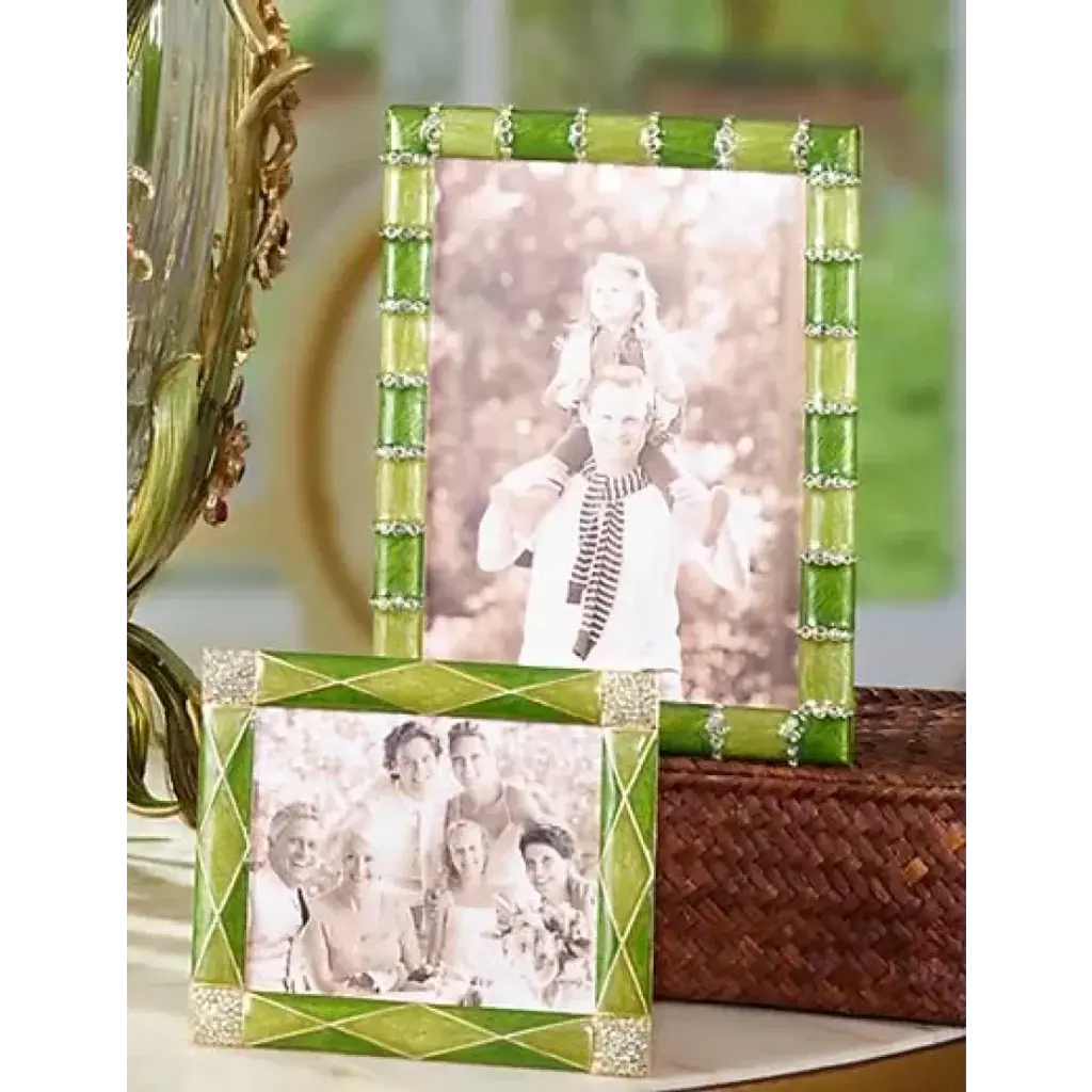 Translucent spring-green enamels shine over this 14K-gold-finished metal frame with Swarovski® crystal edgings. Crafted in Rhode Island and New York.
