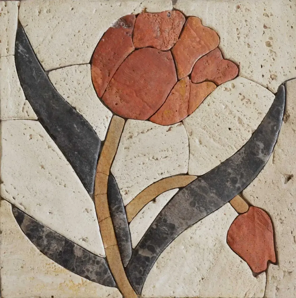 Our beautiful pietra dura divided floral mosaic features a field of tulip flowers in shades of orange. A Petal Mosaic Of Three Tulips That Inspire For Garden And Outdoor Decoration Purposes. It Is Fully Handmade From Natural Stones.