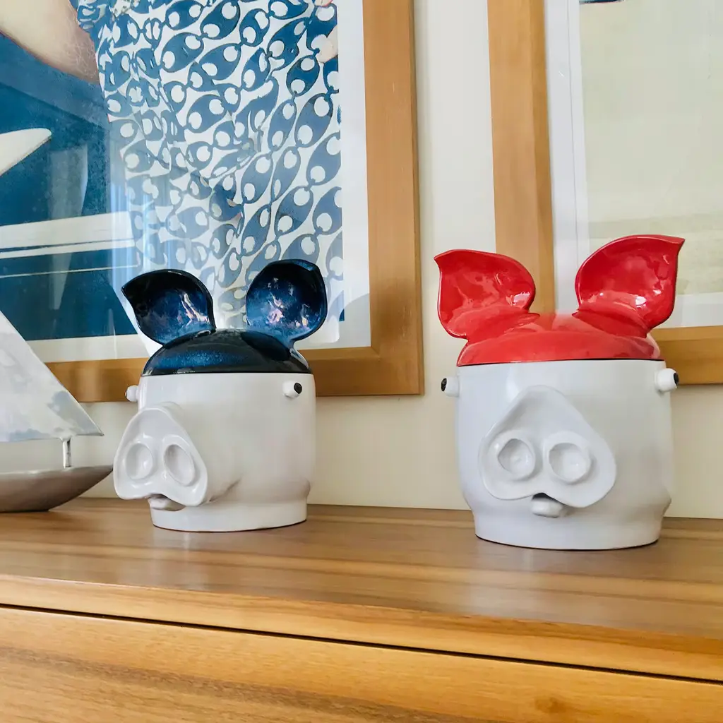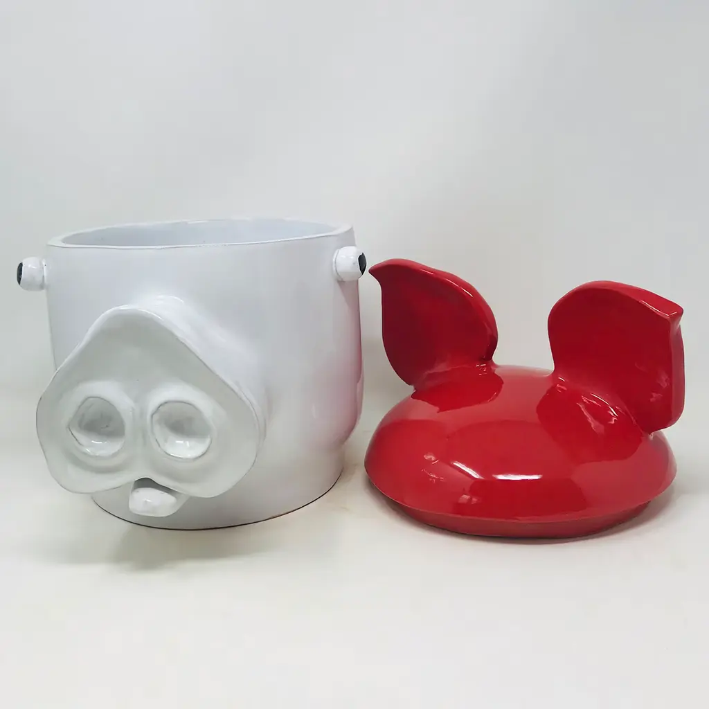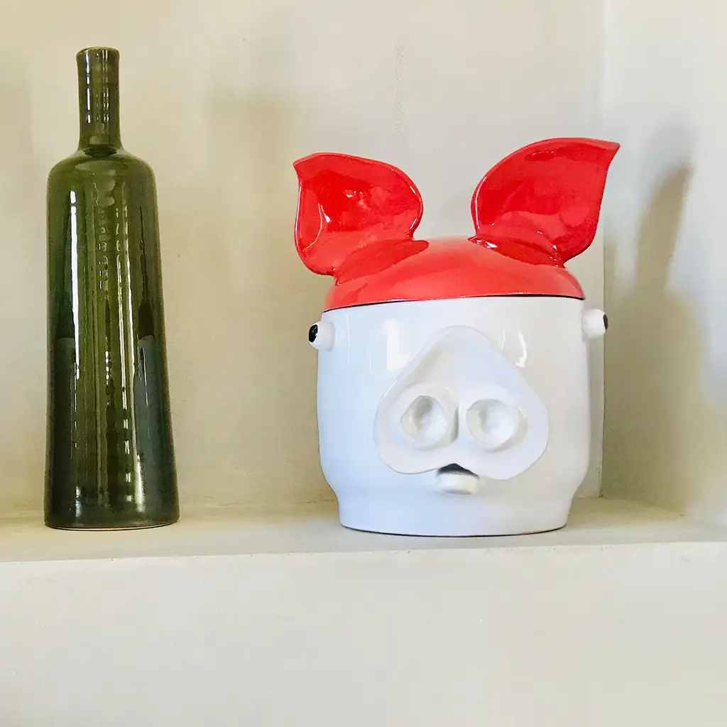 The zoomorphic design of this container with a lid reveals its eccentric character at first glance. Ideal for enlivening modern homes, this handcrafted piece follows the coiling and majolica technique, transforming the clay into terracotta and then sealing the glazes at 960° during the second firing. The ears serve as handles for the red lid, completing the white body distinguished by a protuberant snout. Please check the small version and other colors with the Concierge.