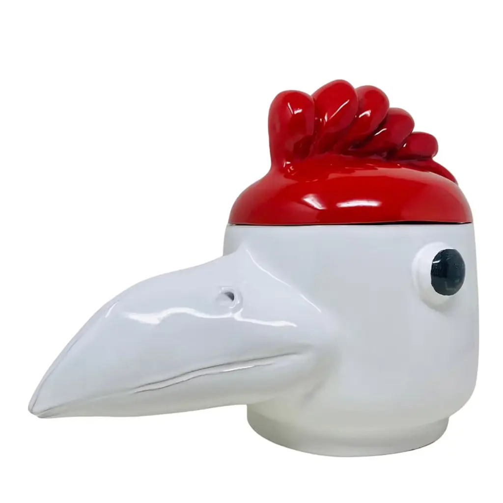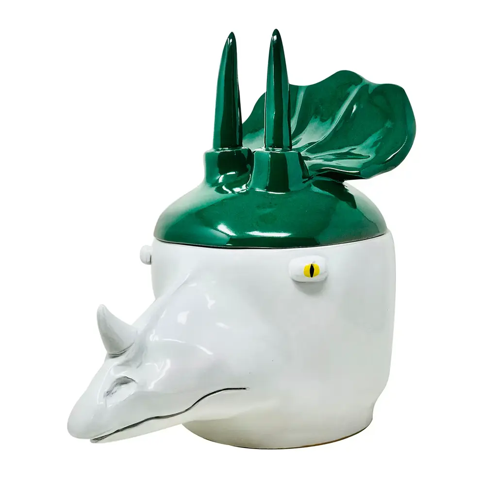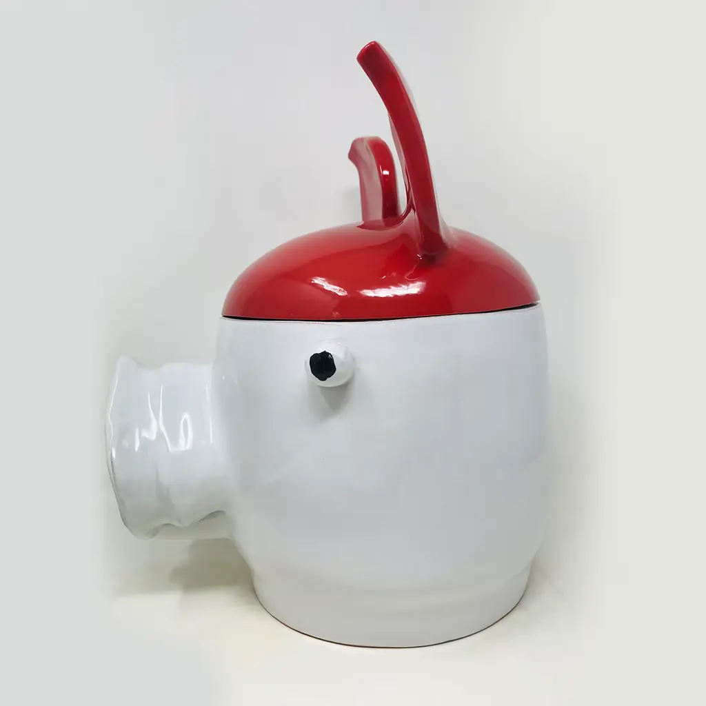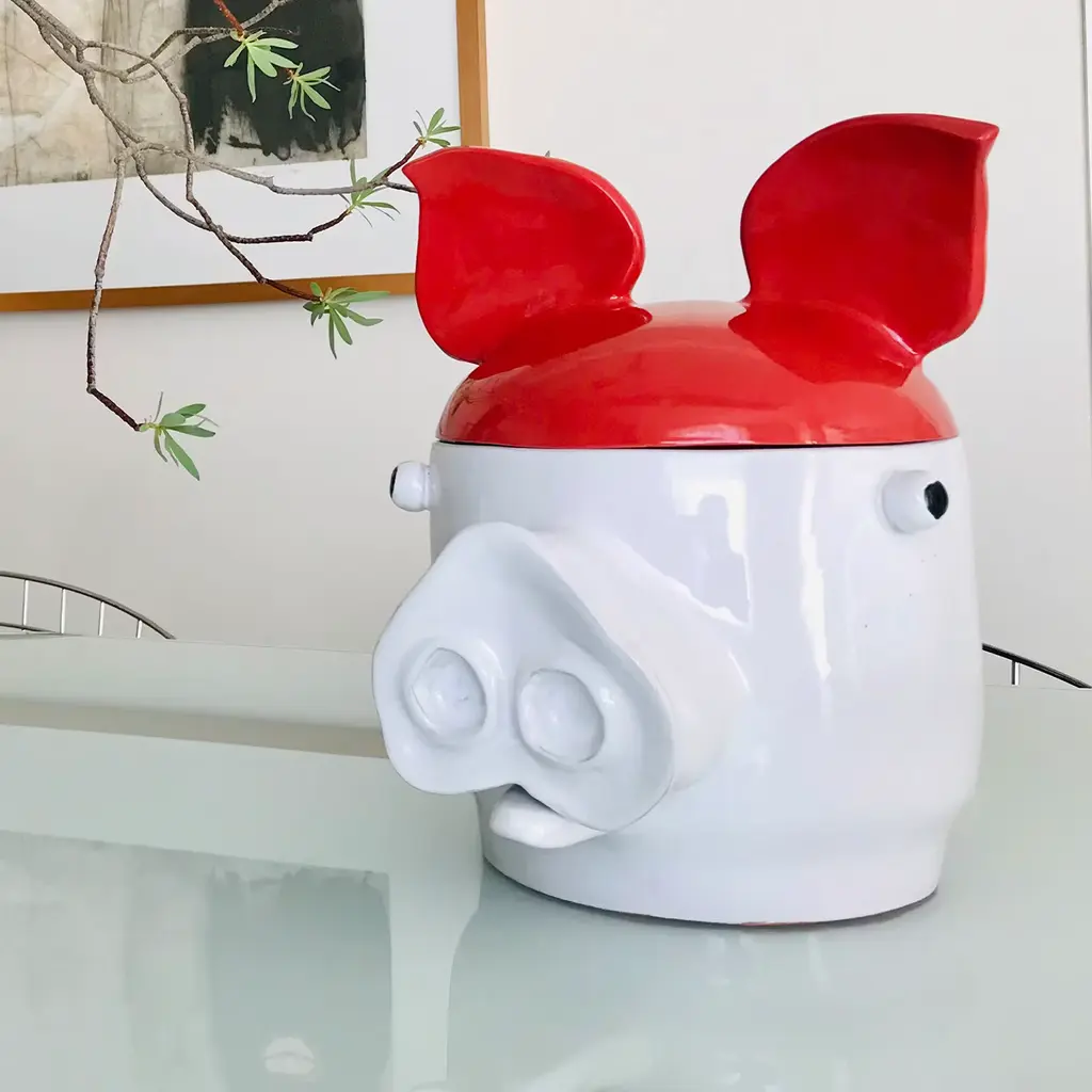 The zoomorphic design of this container with a lid reveals its eccentric character at first glance. Ideal for enlivening modern homes, this handcrafted piece follows the coiling and majolica technique, transforming the clay into terracotta and then sealing the glazes at 960° during the second firing. The ears serve as handles for the red lid, completing the white body distinguished by a protuberant snout. Please check the small version and other colors with the Concierge.