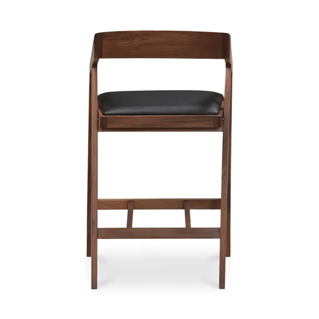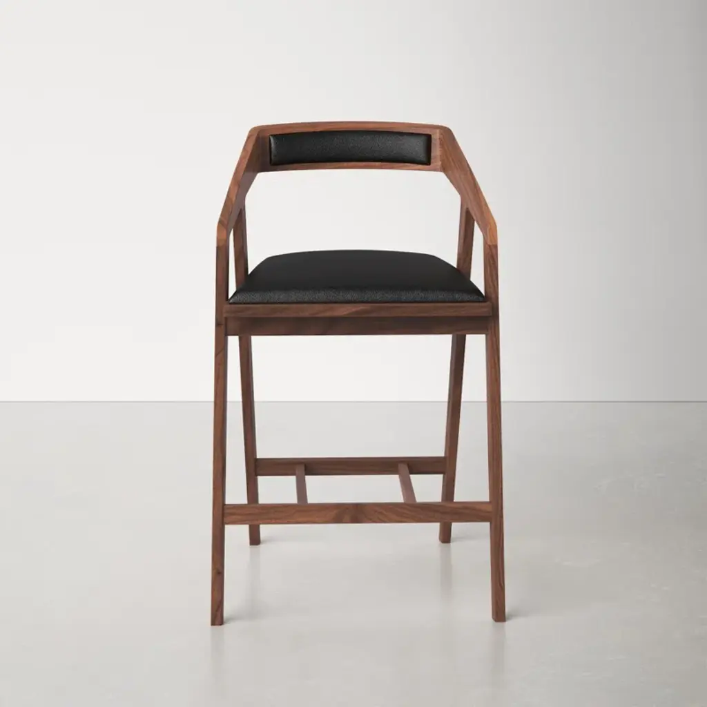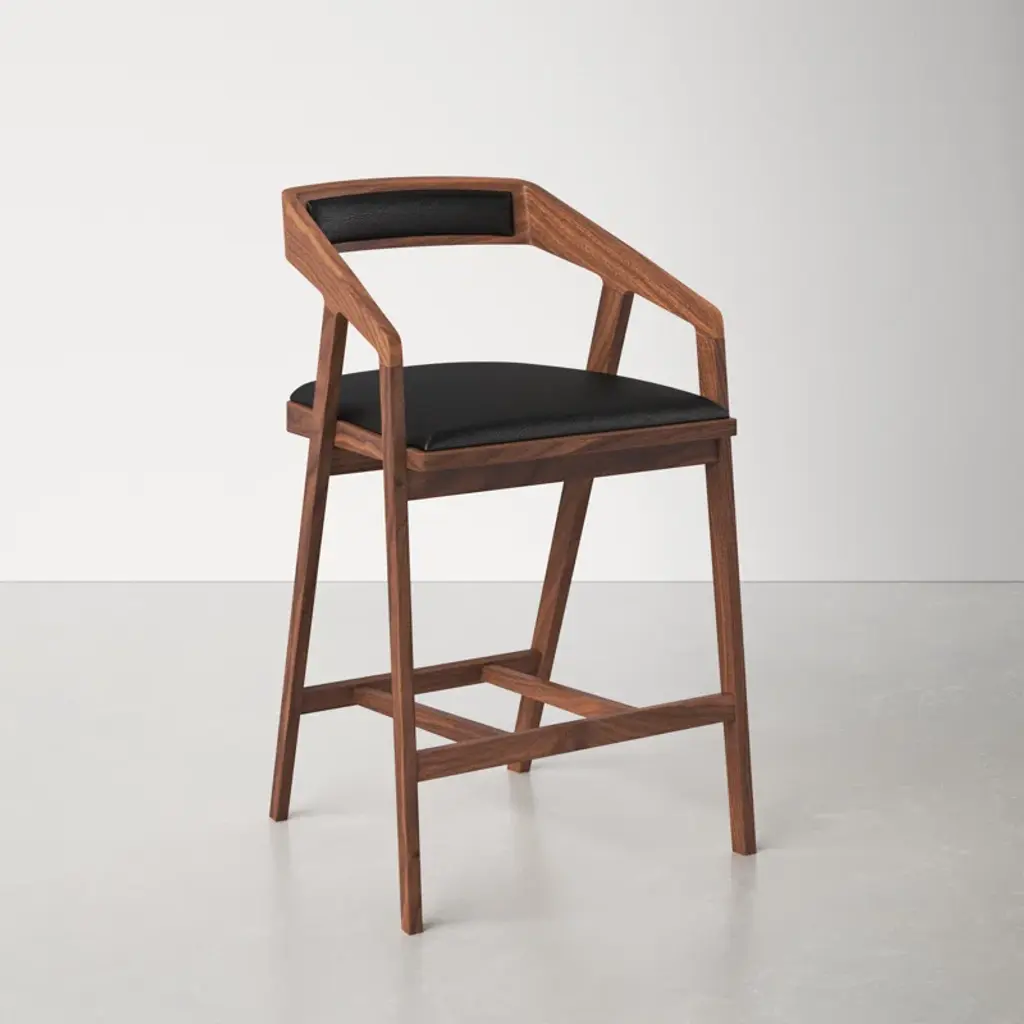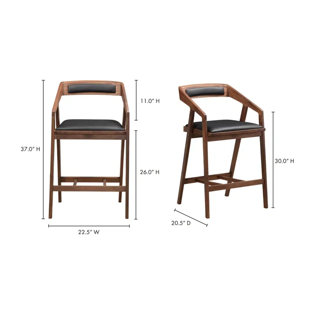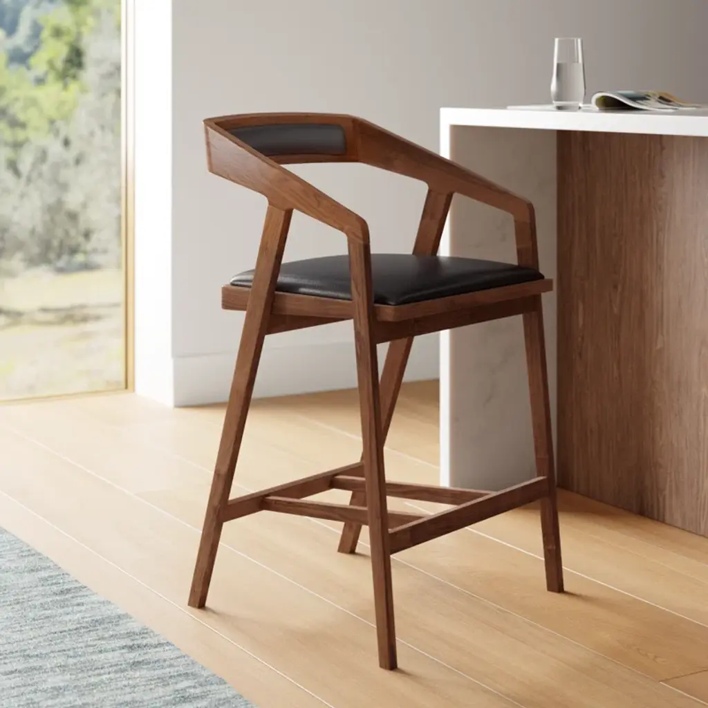 Built with walnut wood, this dining stool’s airy frame is enlivened by sharply angular arms + back legs. Padded upholstery and slatted footrest support you while you enjoy mid-century vibes with your evening drink. A low back keeps sightlines open, and plastic glides save floors from scratches.