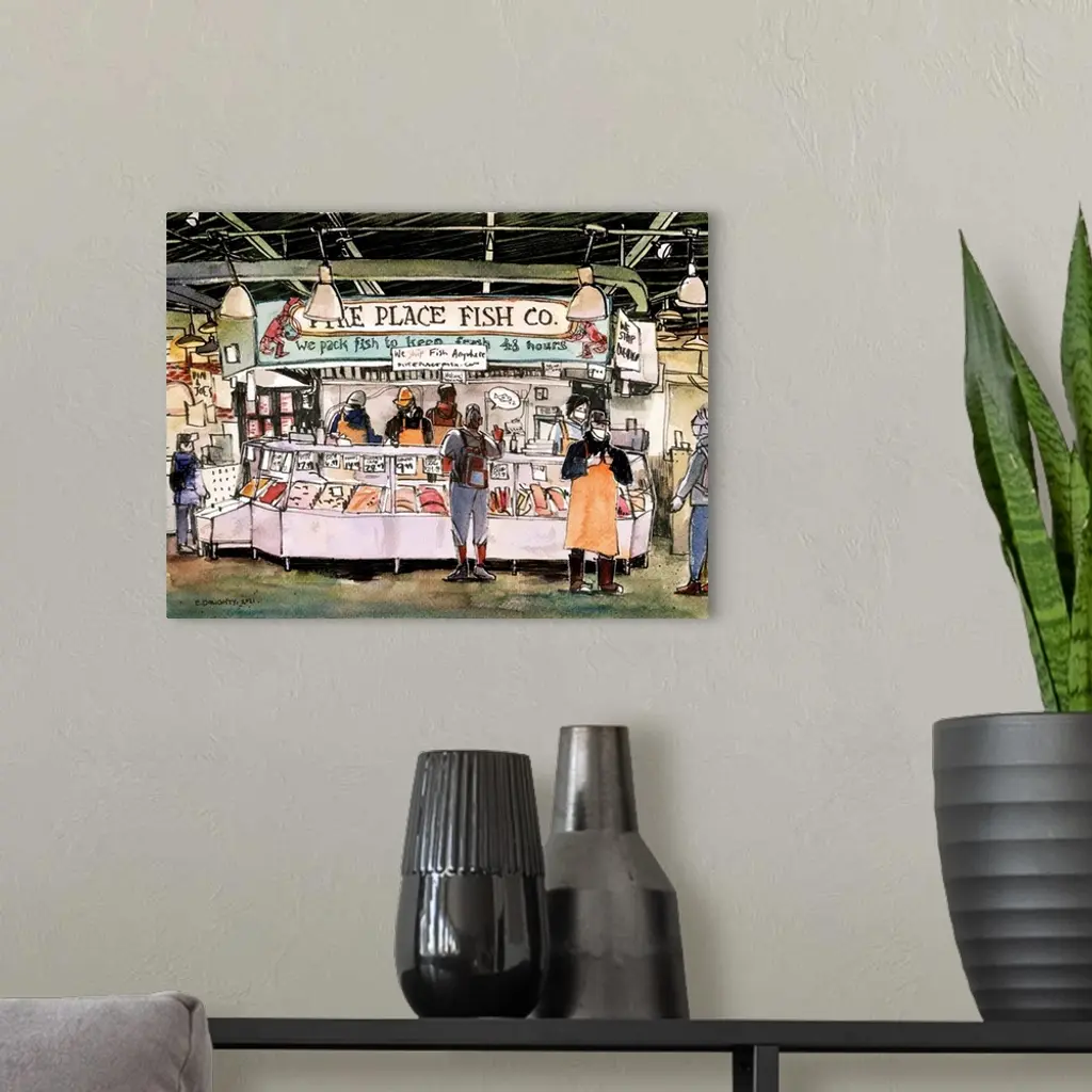 The famous fish throwers of Pike Place Market! On a not-so-busy day, the artist visited the market to see the fish sellers, and captured the scene in ink and watercolor.