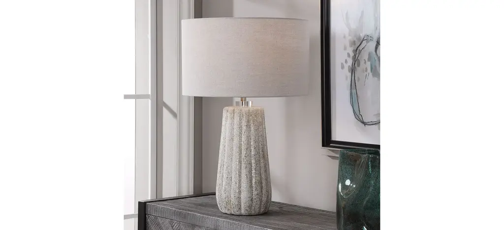 This ceramic table lamp features a fluted design with a porous texture finished in a stone-ivory and taupe glaze, accented with brushed nickel plated details and a thick crystal collar. A light gray fabric drum shade completes the look.
