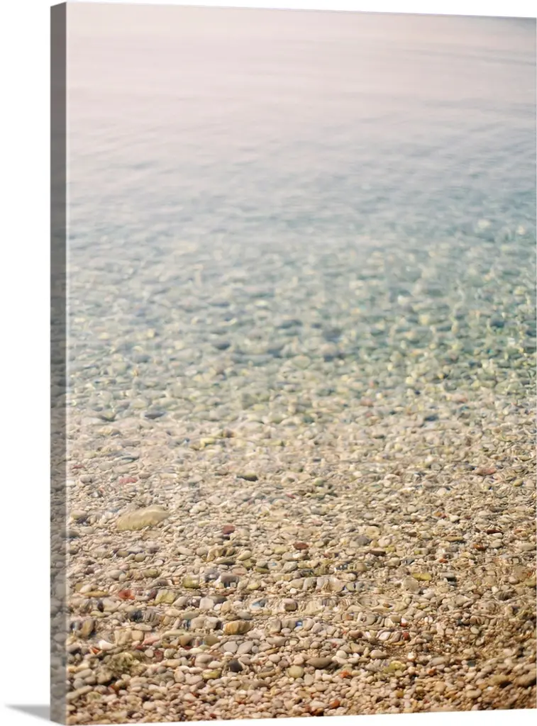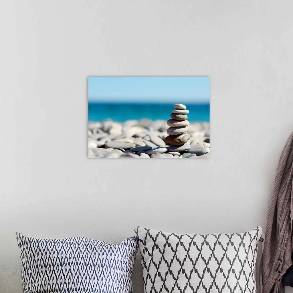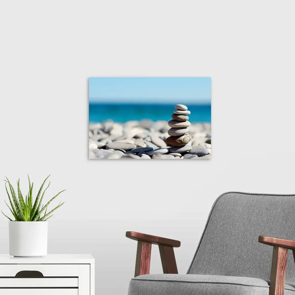 Up-close photograph of seven smoothed pebbles stacked on top of each other sitting on top of a bed of rocks with the ocean in the distance.
