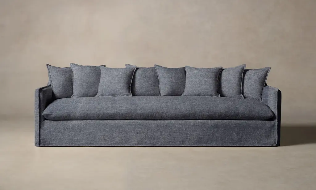 The sofa features a solid fir wood and poplar plywood frame, with a birch plywood backrest for enhanced comfort. The seat cushions are filled with channelized goose down and high-density polyurethane foam, fully reversible. The back cushions are filled with soft goose down. Upholstered in taupe leather with Amster ash velvet piping, it adds a refined touch to any modern space.