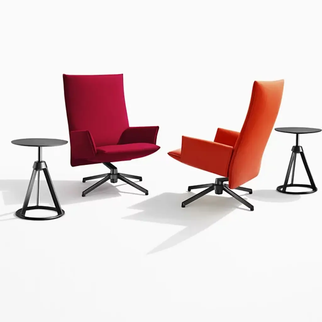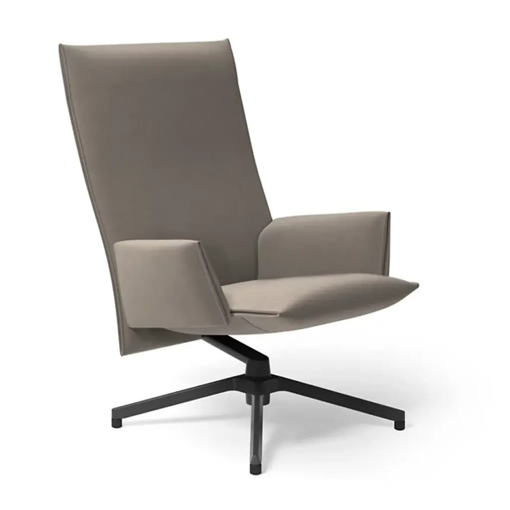 Modernity in both form and function. Read your favorite book or have a leisurely conversation resting on this Pilot Swivel High Back Lounge, Upholstered Arms by Knolls. The cantilevered seat is supported by a sturdy cast aluminum four-star base for stability. It is designed to swivel a complete 360-degree for great flexibility. Upholstered with soft material, it flaunts a high back, subtly padded polyurethane molded foam seat and wrapped arms for exceptional comfort. Its open parallel double side seaming adds depth to the upholstery.